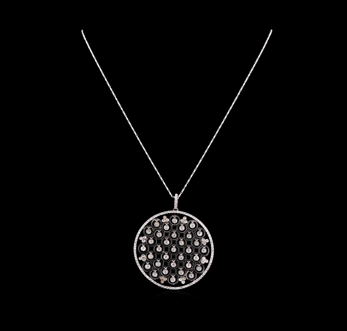 One electronically tested 14KT white gold ladies combination cast & assembled diamond pendant & chain 18.0" long, fancy link with a lobster claw clasp with a bright polish finish. Identified with markings of "K14". Condition is new. Containing: One Hundred Three prong set round brilliant cut diamonds, measuring 1.80 - 1.30 x 0.93mm (depth est.) approximate total weight of 103 Stones = 1.40ct. Clarity: SI-1 to SI-2. Color: I - J, Cut is Good. All diamonds are graded in the mounting, unless otherwise stated. Total Weight of Diamonds 1.40ct. Total Weight of Pendant & Chain 15.90 grams. GGL Appraised at $8,530.00.