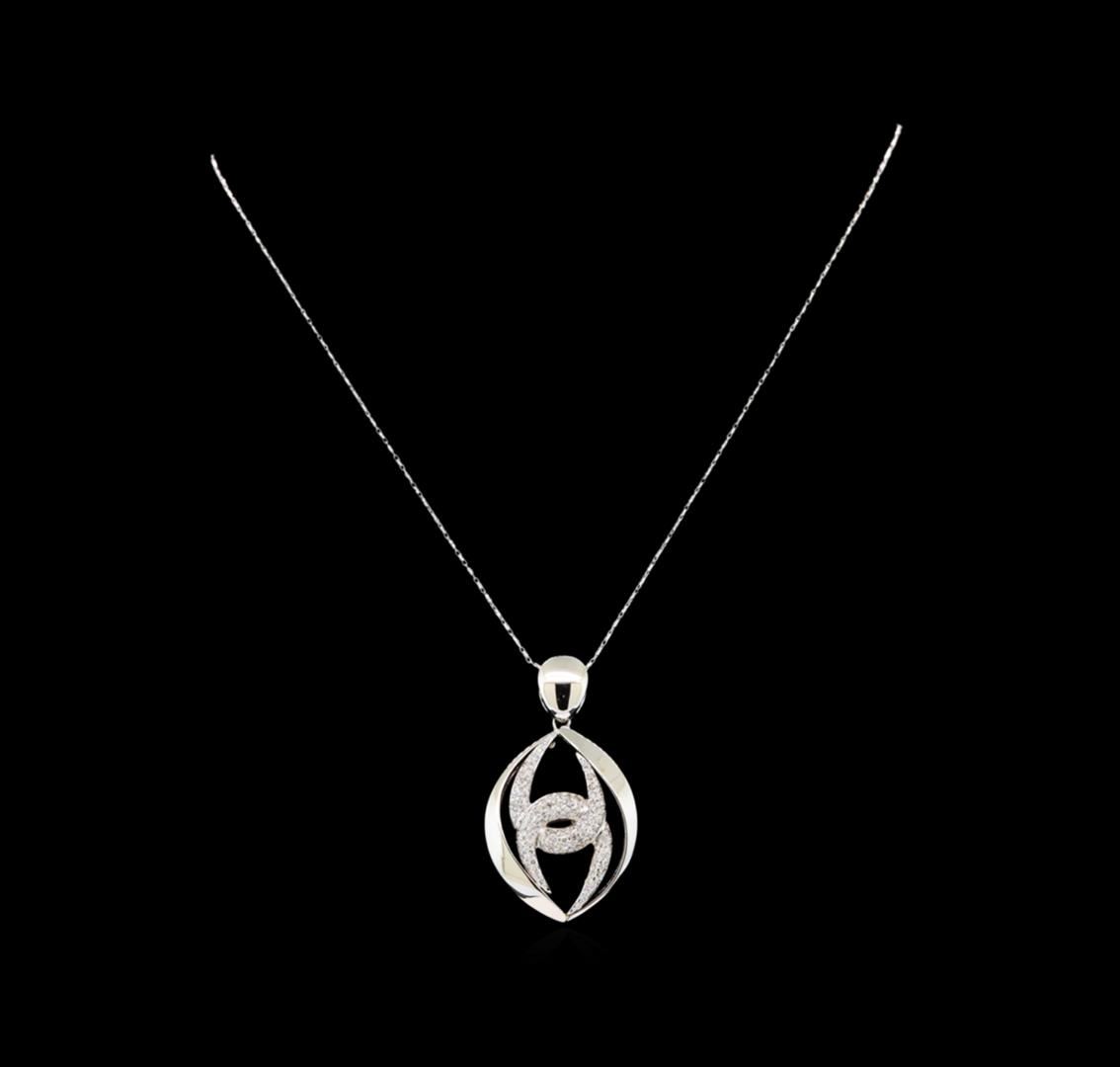 One electronically tested 14KT white gold ladies cast & assembled diamond pendant with chain. The pendant features two intertwining diamond set "u" shapes set within mirroring white gold ribbons, completed by a white gold bail. The pendant is supported by an eighteen inch length 14KT white gold designer style chain, terminating in a lobster claw clasp. Identified with markings of "14K". Condition is new, good workmanship. Containing: Ninety-Six prong set round brilliant cut diamonds, measuring 1.60 - 1.50 x 0.93mm (depth est.) approximate total weight of 96 Stones = 1.40ct. Graded in the setting. Clarity: SI-1 to I-1. Color: H - J. Total Weight of Diamonds 1.40ct. Total Weight of Pendant With Chain 13.81 grams. AIG Appraised at $6,295.00.