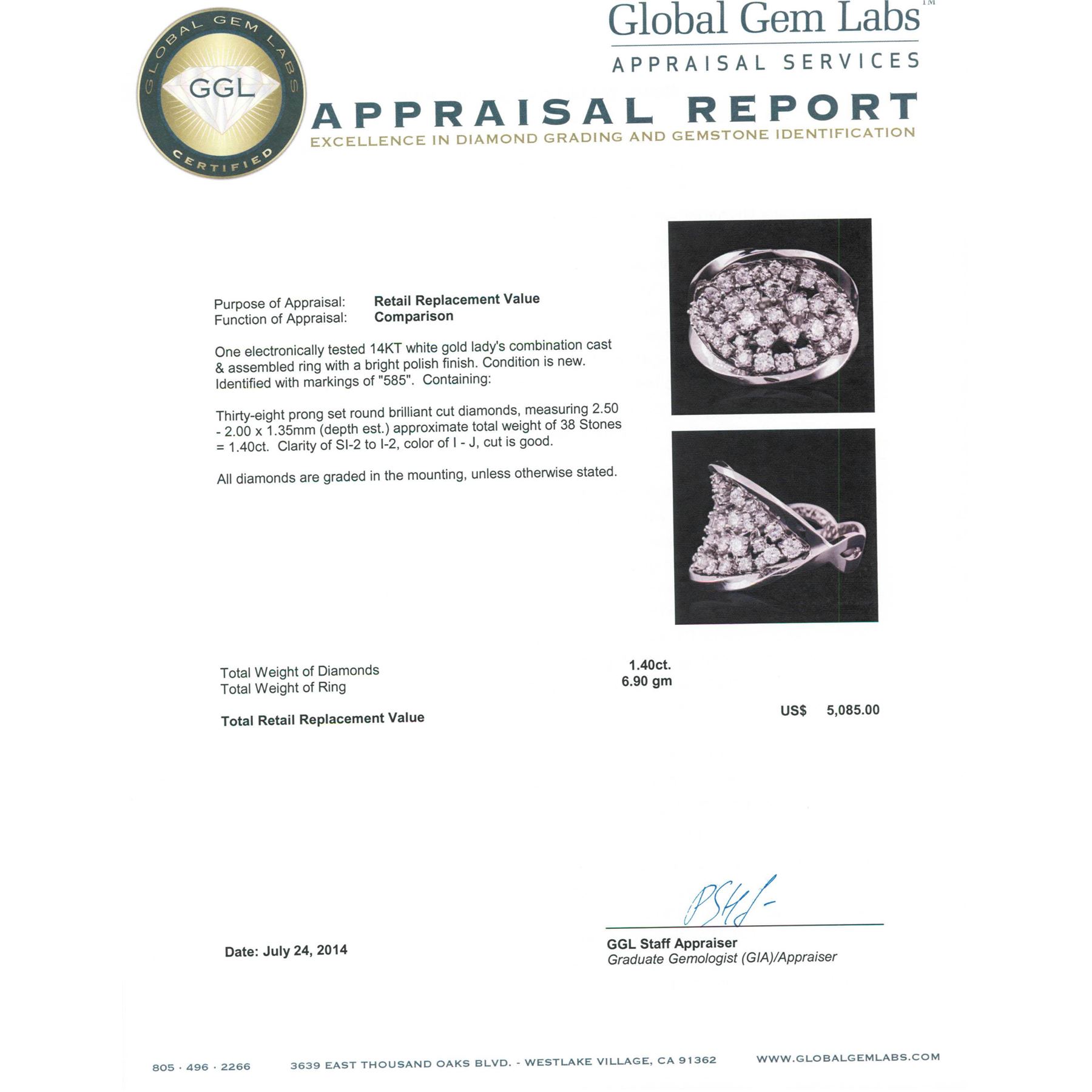 One electronically tested 14KT white gold ladies combination cast & assembled ring with a bright polish finish. Condition is new. Identified with markings of "585". Containing: Thirty-Eight prong set round brilliant cut diamonds, measuring 2.50 - 2.00 x 1.35mm (depth est.) approximate total weight of 38 Stones = 1.40ct. Clarity: SI-2 to I-2. Color: I - J, Cut is Good. All diamonds are graded in the mounting, unless otherwise stated. Total Weight of Diamonds 1.40ct. Total Weight of Ring 6.90 grams. GGL Appraised at $5,085.00.