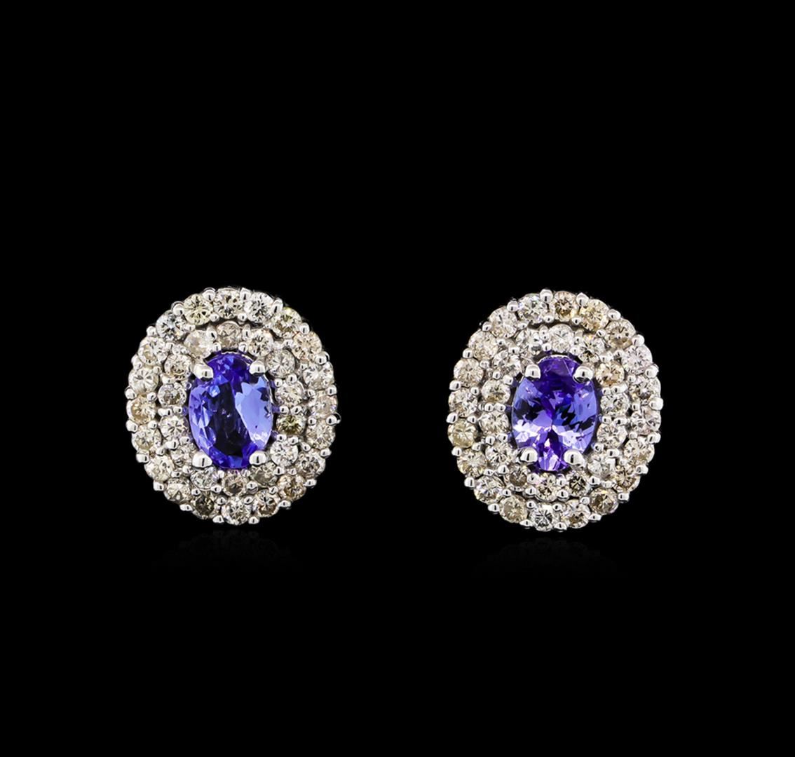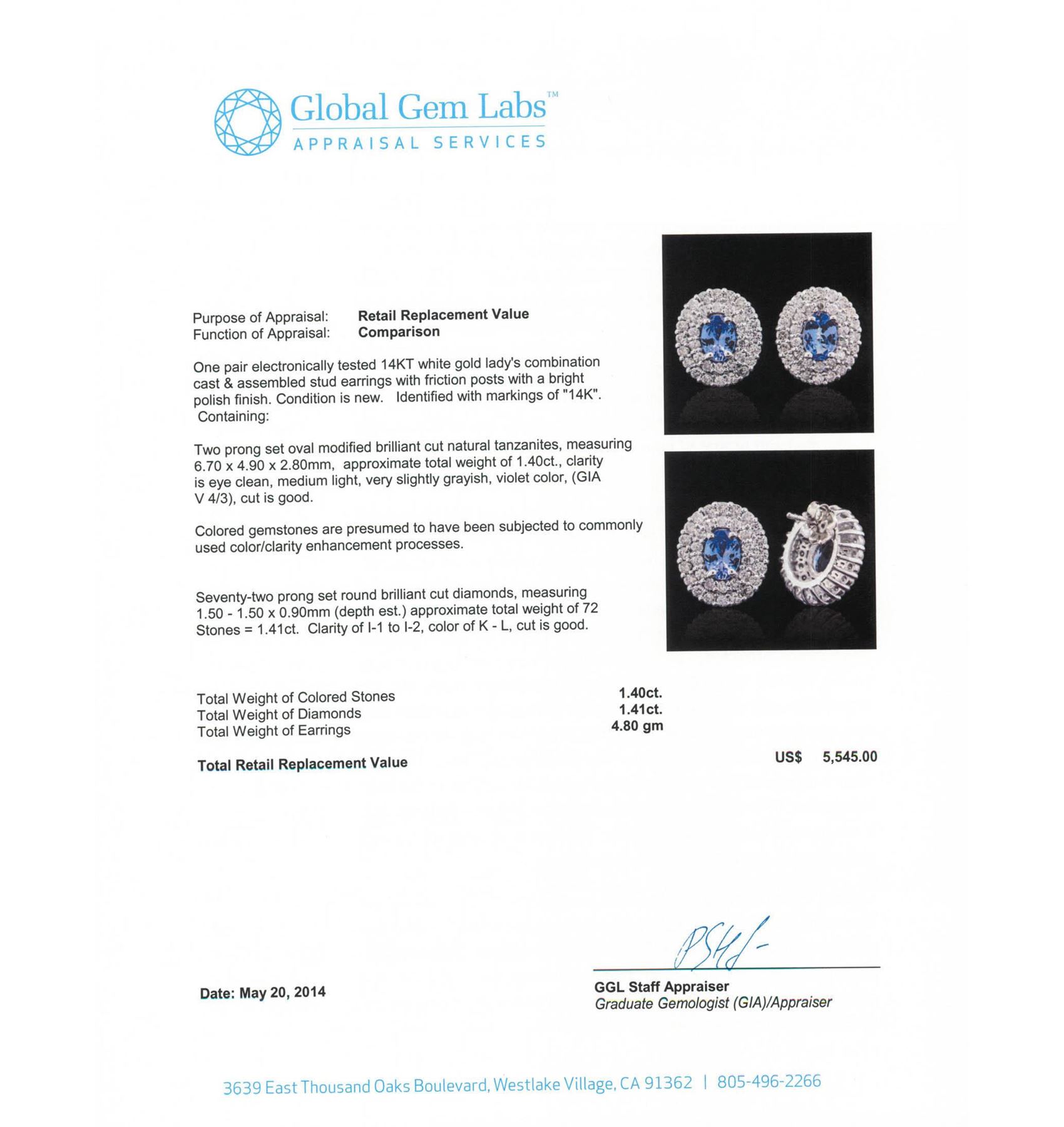 One pair electronically tested 14KT white gold Ladies combination cast & assembled stud earrings with friction posts with a bright polish finish. Condition is new. Identified with markings of "14K". Containing: Two prong set oval modified brilliant cut natural tanzanites, measuring 6.70 x 4.90 x 2.80mm, approximate. Total Weight of 1.40ct., clarity is eye clean, medium light, very slightly grayish, violet color, (GIA V 4/3), cut is good. Colored gemstones are presumed to have been subjected to commonly used color/clarity enhancement processes. Seventy-Two prong set round brilliant cut diamonds, measuring 1.50 - 1.50 x 0.90mm (depth est.) approximate. Total Weight of 72 Stones = 1.41ct. Clarity: I-1 to I-2. Color: K - L, Cut is Good. Total Weight of Colored Stones 1.40ct. Total Weight of Diamonds 1.41ct. Total Weight of Earrings 4.80 grams. GGL Appraised at $5,545.00.