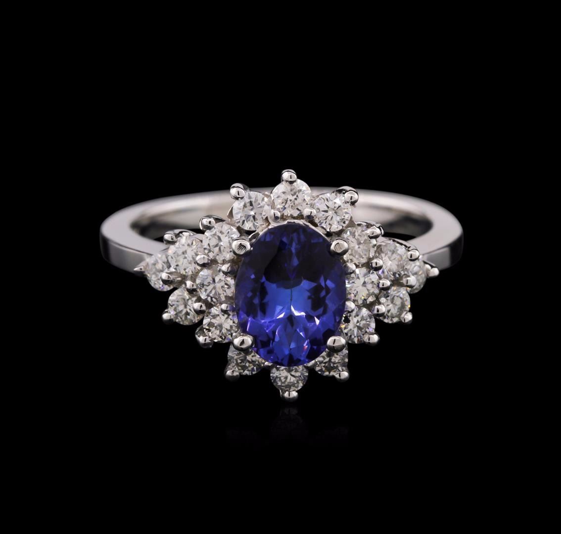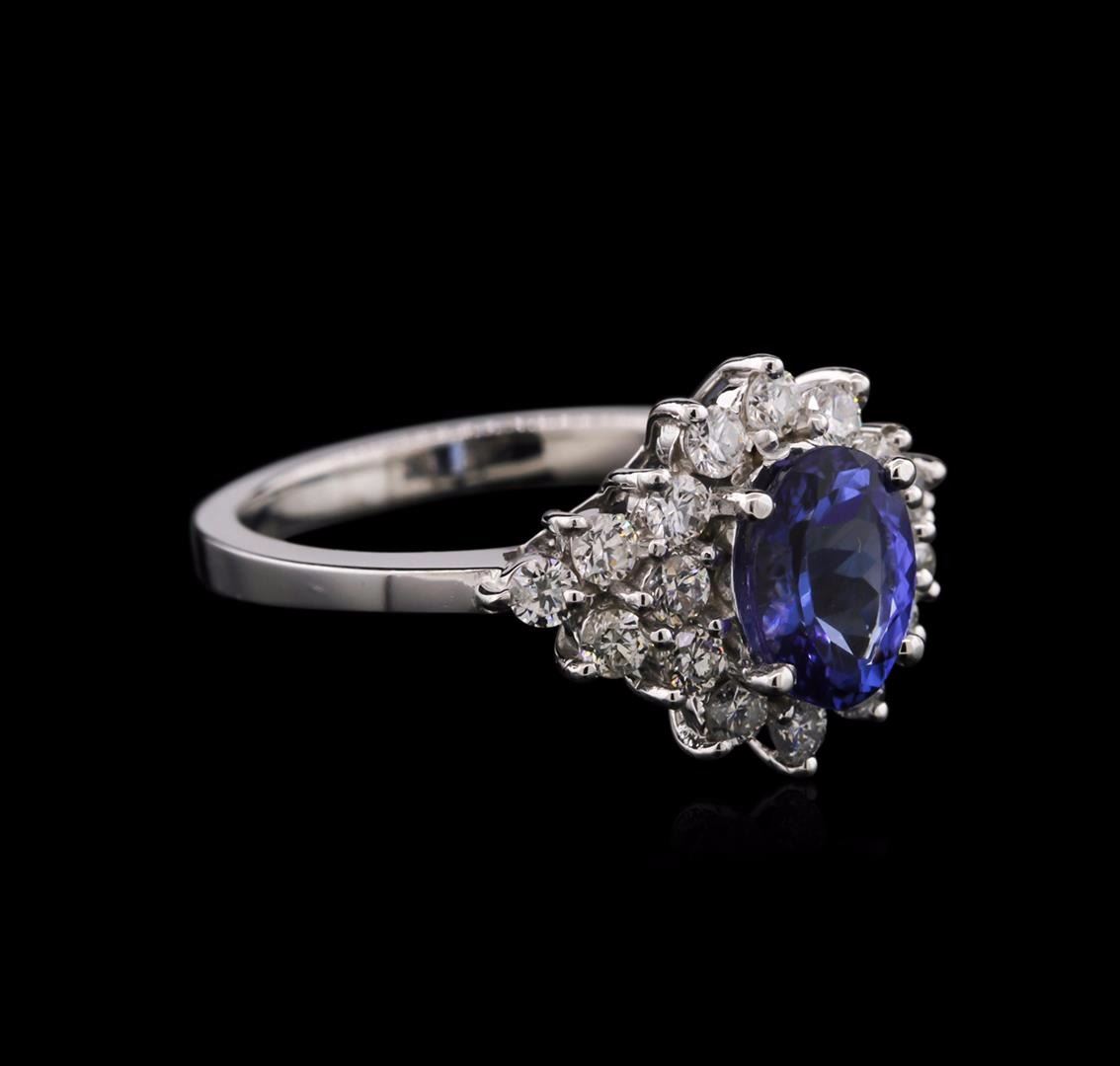 One electronically tested 14KT white gold ladies cast tanzanite and diamond ring with a bright polish finish. Identified with markings of "14K". Condition is new. Containing: One prong set oval modified brilliant cut natural tanzanite, measuring 8.00 x 6.20 x 4.03mm, approximate weight of 1.40ct., clarity is eye clean, type I, medium light, very slightly grayish, violet color, (GIA V 4/3), cut is good. Eighteen prong set round brilliant cut diamonds, measuring 2.10 - 2.10 x 1.26mm (depth est.) approximate total weight of 18 Stones = 0.72ct. Clarity: SI-2 to I-1. Color: G - H, Cut is Good. Colored gemstones are presumed to have been subjected to commonly used enhancement processes. All diamonds and colored gemstones are graded in the mounting, unless otherwise stated. Total Weight of Colored Stones 1.40ct. Total Weight of Diamonds 0.72ct. Total Weight of Ring 4.40 grams. GGL Appraised at $3,320.00.