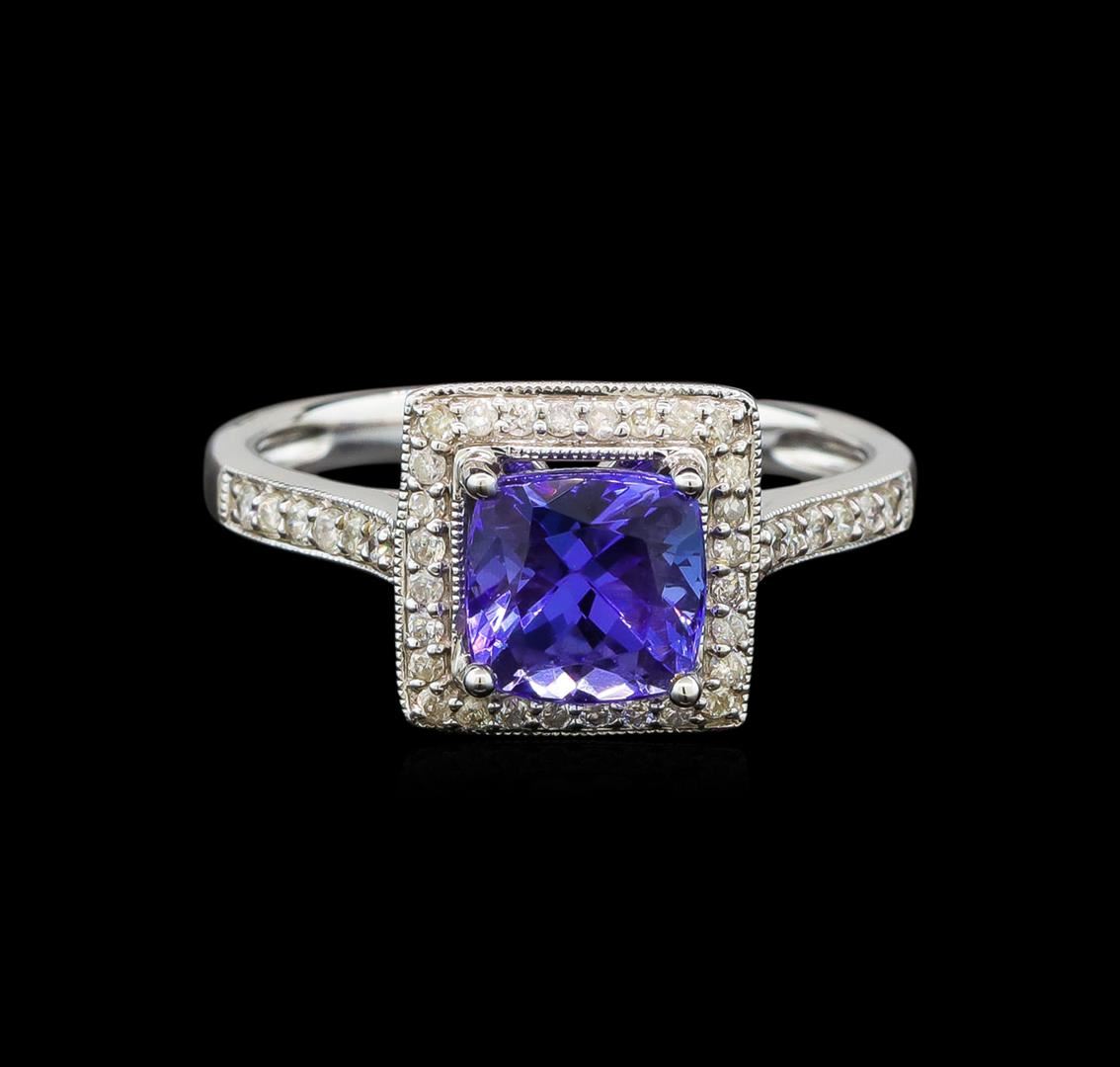 One electronically tested 14KT white gold ladies cast tanzanite and diamond ring with a bright polish finish. Identified with markings of "14K". Condition is new. Containing: One prong set square cushion modified brilliant cut natural tanzanite, measuring 6.49 x 6.48 x 4.22mm, approximate weight of 1.40ct., clarity is eye clean, type I, medium light, very slightly grayish, violet color, (GIA V 4/3), cut is good. Fifty-Two prong set round brilliant cut diamonds, measuring 1.00 - 1.00 x 0.60mm (depth est.) approximate total weight of 52 Stones = 0.19ct. Clarity: I-1 to I-2. Color: I - J. Colored gemstones are presumed to have been subjected to commonly used enhancement processes. All diamonds and colored gemstones are graded in the mounting, unless otherwise stated. Total Weight of Colored Stones 1.40ct. Total Weight of Diamonds 0.19ct. Total Weight of Ring 3.50 grams. GGL Appraised at $2,405.00.