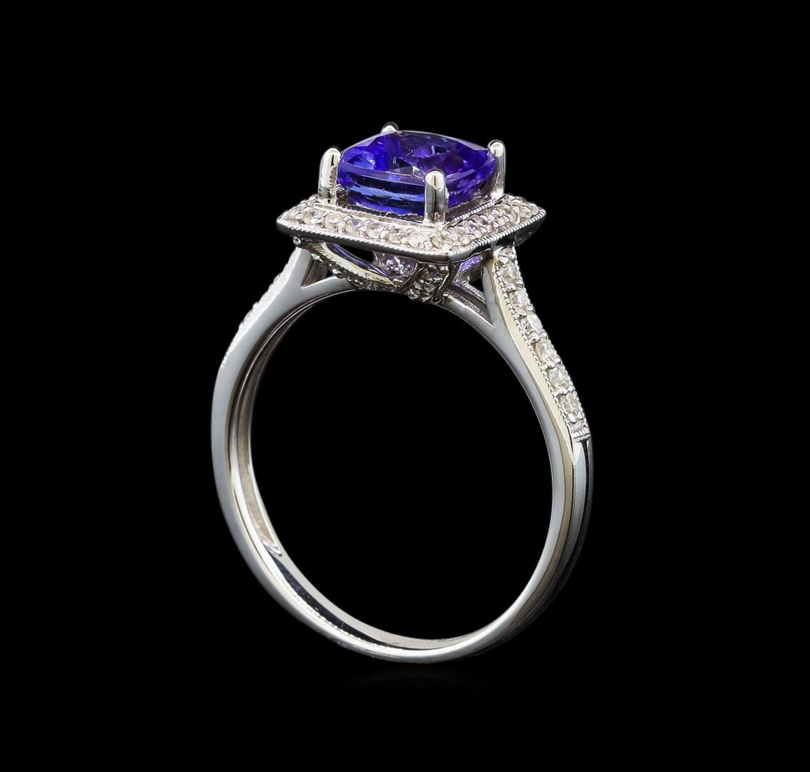 One electronically tested 14KT white gold ladies cast tanzanite and diamond ring with a bright polish finish. Identified with markings of "14K". Condition is new. Containing: One prong set square cushion modified brilliant cut natural tanzanite, measuring 6.49 x 6.48 x 4.22mm, approximate weight of 1.40ct., clarity is eye clean, type I, medium light, very slightly grayish, violet color, (GIA V 4/3), cut is good. Fifty-Two prong set round brilliant cut diamonds, measuring 1.00 - 1.00 x 0.60mm (depth est.) approximate total weight of 52 Stones = 0.19ct. Clarity: I-1 to I-2. Color: I - J. Colored gemstones are presumed to have been subjected to commonly used enhancement processes. All diamonds and colored gemstones are graded in the mounting, unless otherwise stated. Total Weight of Colored Stones 1.40ct. Total Weight of Diamonds 0.19ct. Total Weight of Ring 3.50 grams. GGL Appraised at $2,405.00.