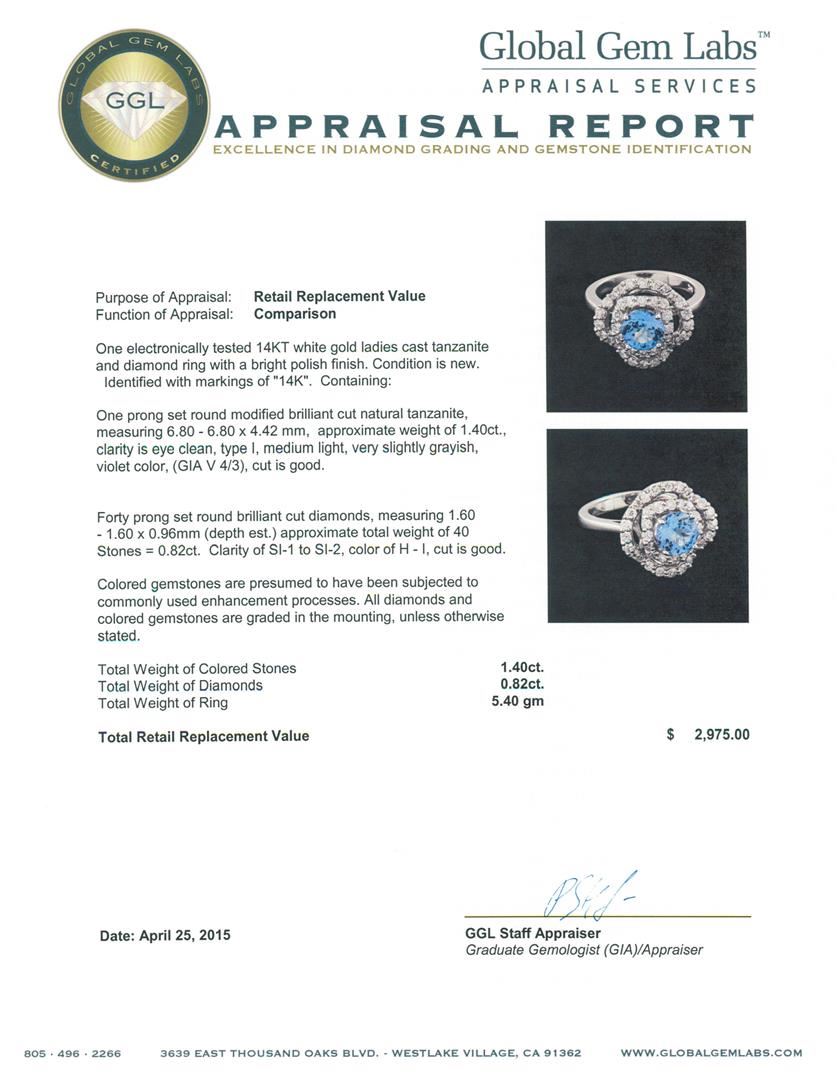One electronically tested 14KT white gold ladies cast tanzanite and diamond ring with a bright polish finish. Identified with markings of "14K". Condition is new. Containing: One prong set round modified brilliant cut natural tanzanite, measuring 6.80 - 6.80 x 4.42 mm, approximate weight of 1.40ct., clarity is eye clean, type I, medium light, very slightly grayish, violet color, (GIA V 4/3), cut is good. Forty prong set round brilliant cut diamonds, measuring 1.60 - 1.60 x 0.96mm (depth est.) approximate total weight of 40 Stones = 0.82ct. Clarity: SI-1 to SI-2. Color: H - I, Cut is Good. Colored gemstones are presumed to have been subjected to commonly used enhancement processes. All diamonds and colored gemstones are graded in the mounting, unless otherwise stated. Total Weight of Colored Stones 1.40ct. Total Weight of Diamonds 0.82ct. Total Weight of Ring 5.40 grams. GGL Appraised at $2,975.00.