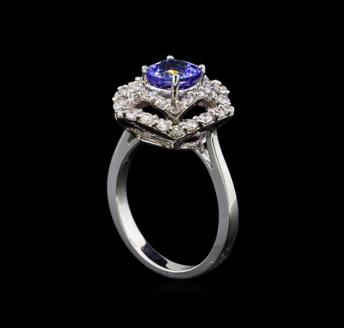 One electronically tested 14KT white gold ladies cast tanzanite and diamond ring with a bright polish finish. Identified with markings of "14K". Condition is new. Containing: One prong set round modified brilliant cut natural tanzanite, measuring 6.80 - 6.80 x 4.42 mm, approximate weight of 1.40 ct., clarity is eye clean, type I, medium light, very slightly grayish, violet color, (GIA V 4/3), cut is good. Forty prong set round brilliant cut diamonds, measuring 1.60 - 1.60 x 0.96mm (depth est.) approximate total weight of 40 Stones = 0.82ct. Clarity: SI-1 to SI-2. Color: H - I, Cut is Good. Colored gemstones are presumed to have been subjected to commonly used enhancement processes. All diamonds and colored gemstones are graded in the mounting, unless otherwise stated. Total Weight of Colored Stones 1.40 ct. Total Weight of Diamonds 0.82ct. Total Weight of Ring 5.40 grams. GGL Appraised.