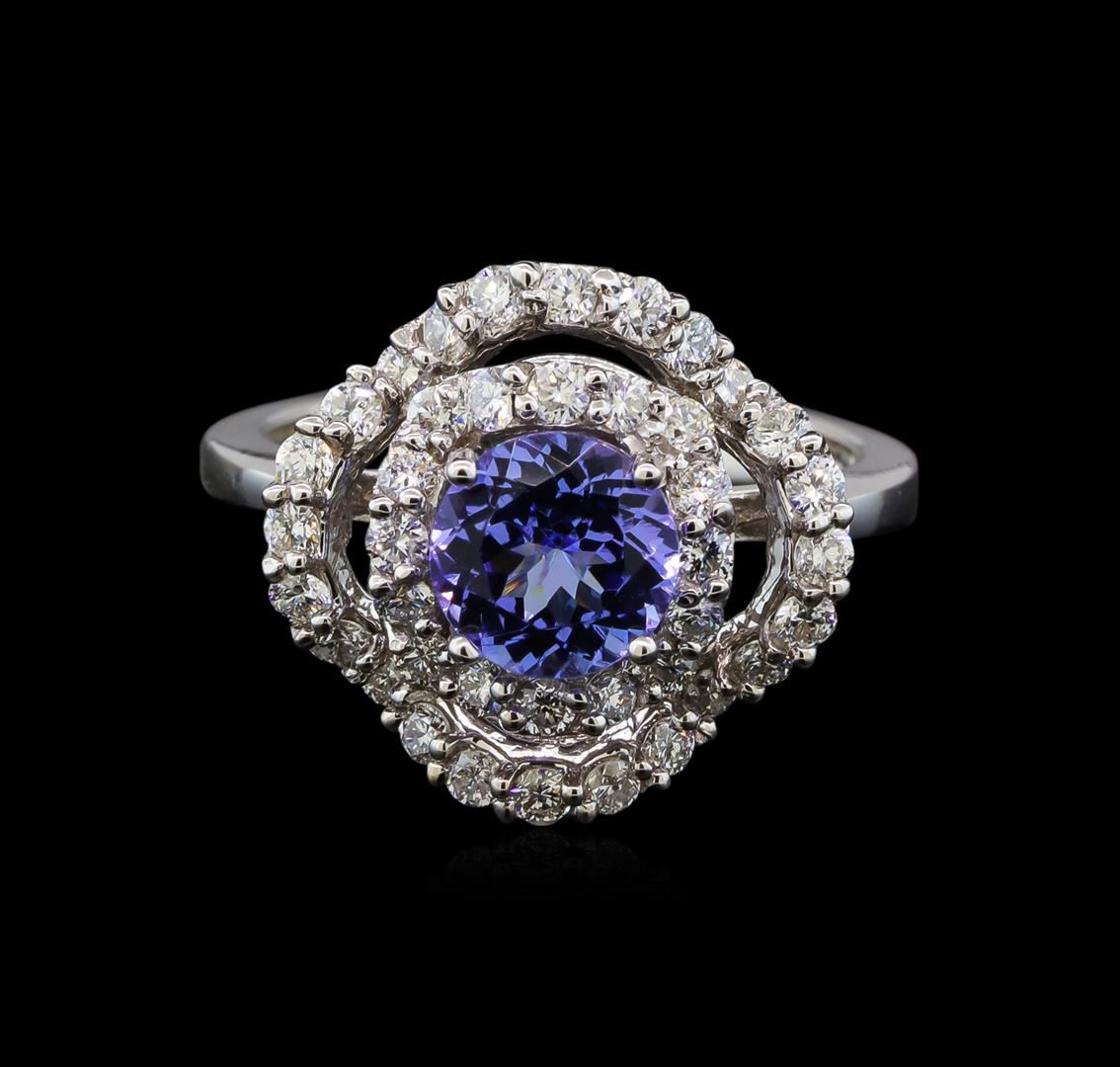 One electronically tested 14KT white gold ladies cast tanzanite and diamond ring with a bright polish finish. Identified with markings of "14K". Condition is new. Containing: One prong set round modified brilliant cut natural tanzanite, measuring 6.80 - 6.80 x 4.42 mm, approximate weight of 1.40 ct., clarity is eye clean, type I, medium light, very slightly grayish, violet color, (GIA V 4/3), cut is good. Forty prong set round brilliant cut diamonds, measuring 1.60 - 1.60 x 0.96mm (depth est.) approximate total weight of 40 Stones = 0.82ct. Clarity: SI-1 to SI-2. Color: H - I, Cut is Good. Colored gemstones are presumed to have been subjected to commonly used enhancement processes. All diamonds and colored gemstones are graded in the mounting, unless otherwise stated. Total Weight of Colored Stones 1.40 ct. Total Weight of Diamonds 0.82ct. Total Weight of Ring 5.40 grams. GGL Appraised.