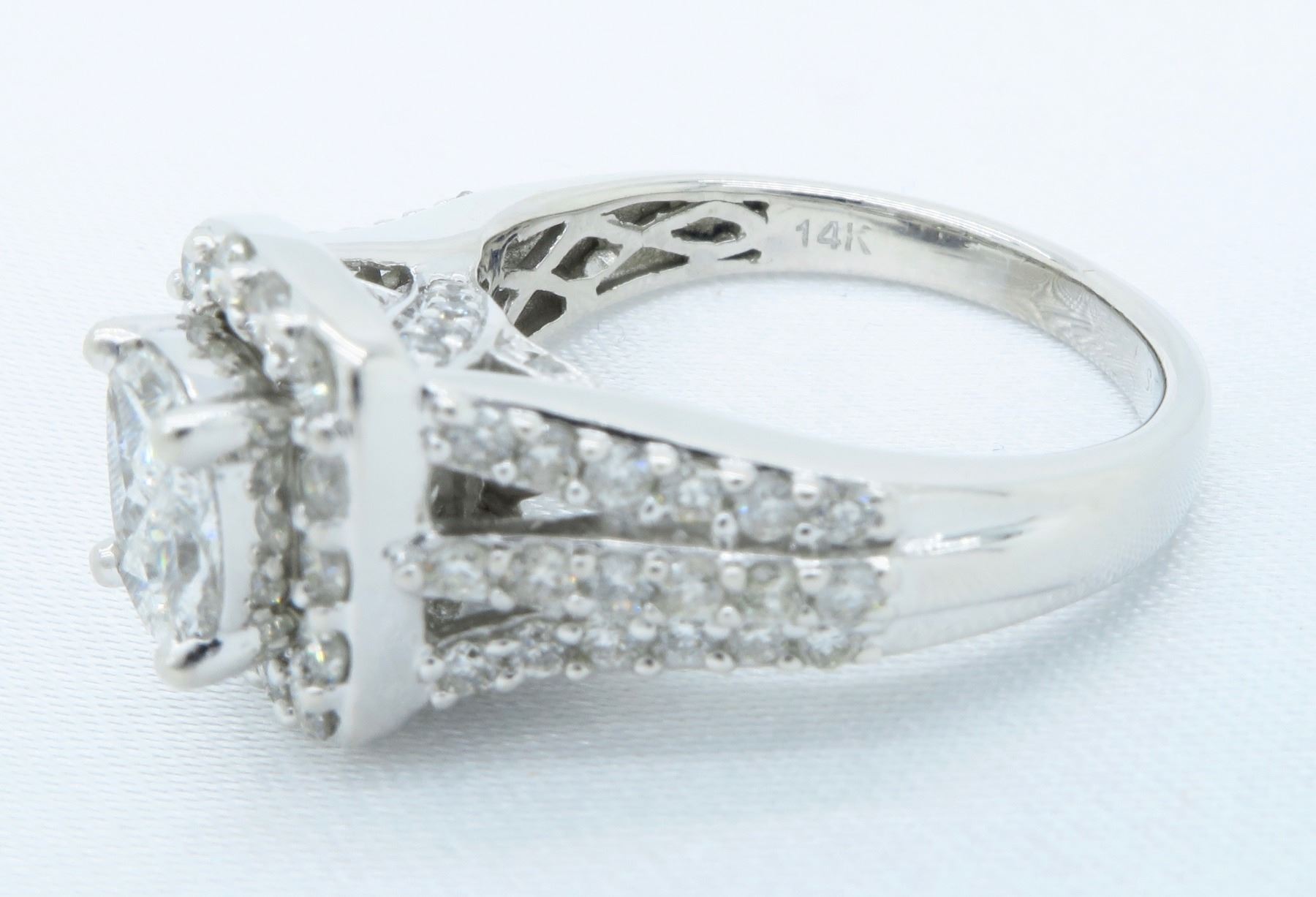 14KT White Gold 1.40ctw Diamond Ring. (4) Trilliant cut Diamonds and (64) round Diamonds with a total weight of 1.40cts with a color of G-I and clarity of SI-2 to I-1. Total weight of this ring is 5 grams. Ring size is 5.75.