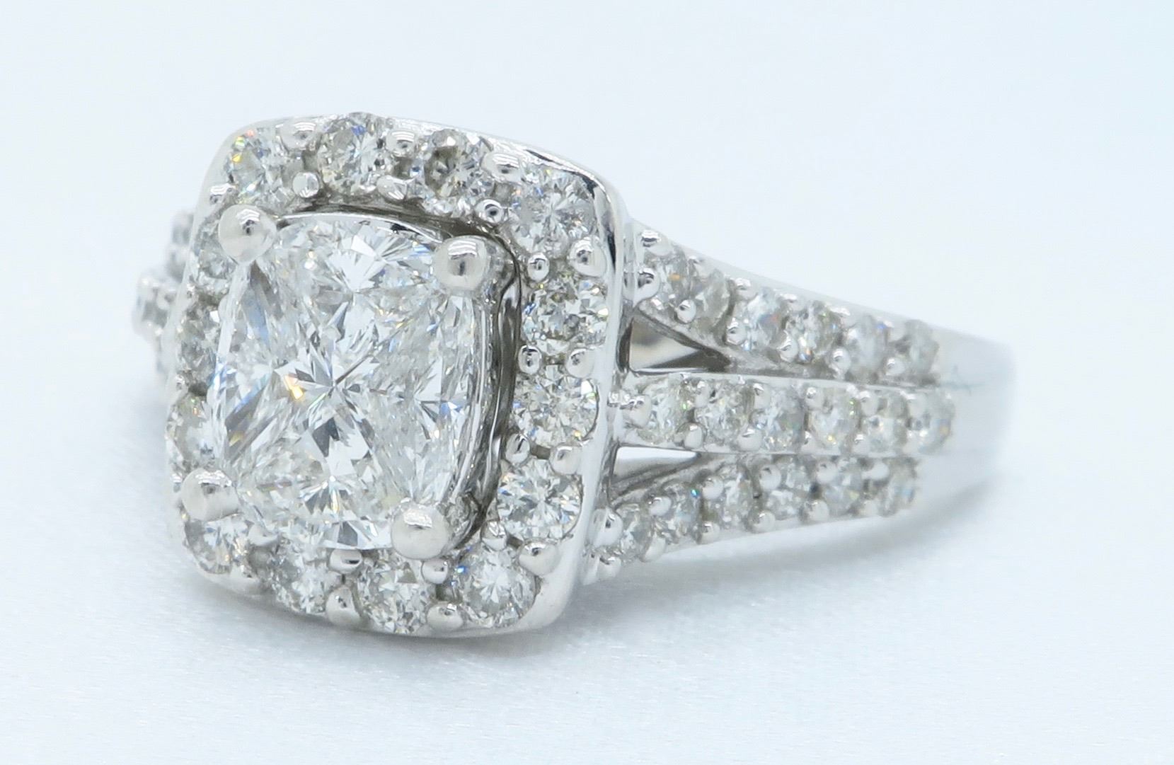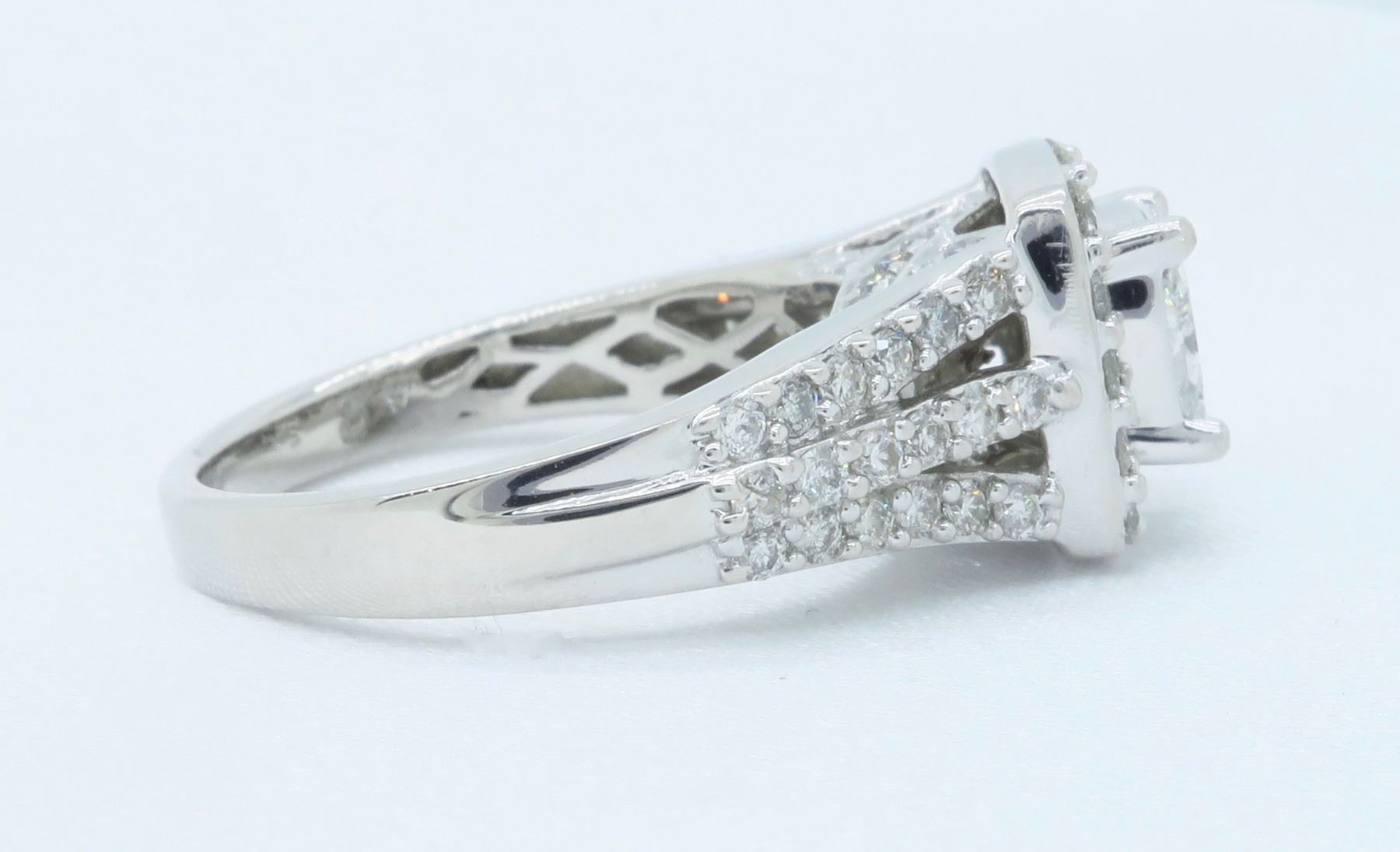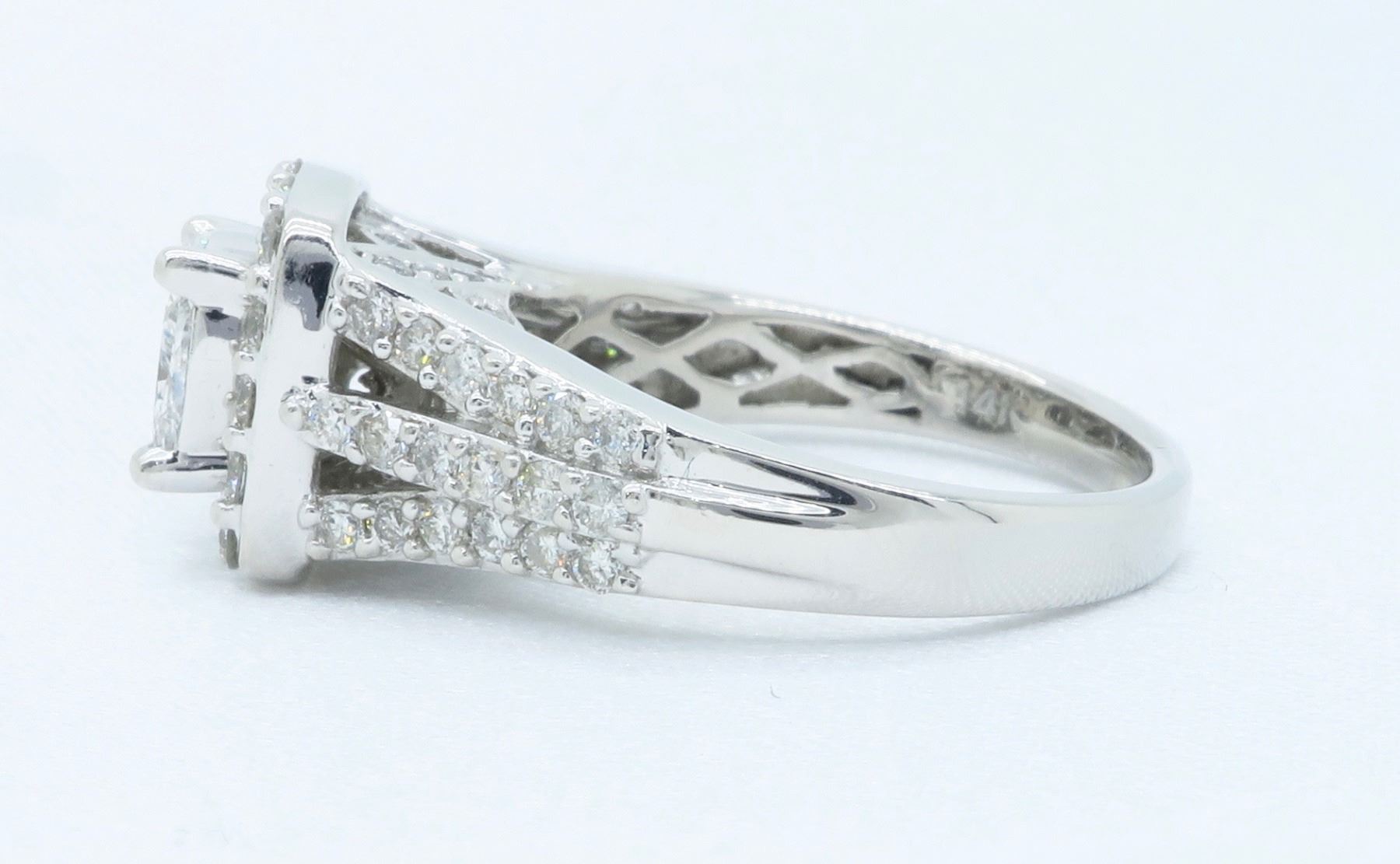 14KT White Gold 1.40ctw Diamond Ring. (4) Trilliant cut Diamonds and (64) round Diamonds with a total weight of 1.40cts with a color of G-I and clarity of SI-2 to I-1. Total weight of this ring is 5 grams. Ring size is 5.75.