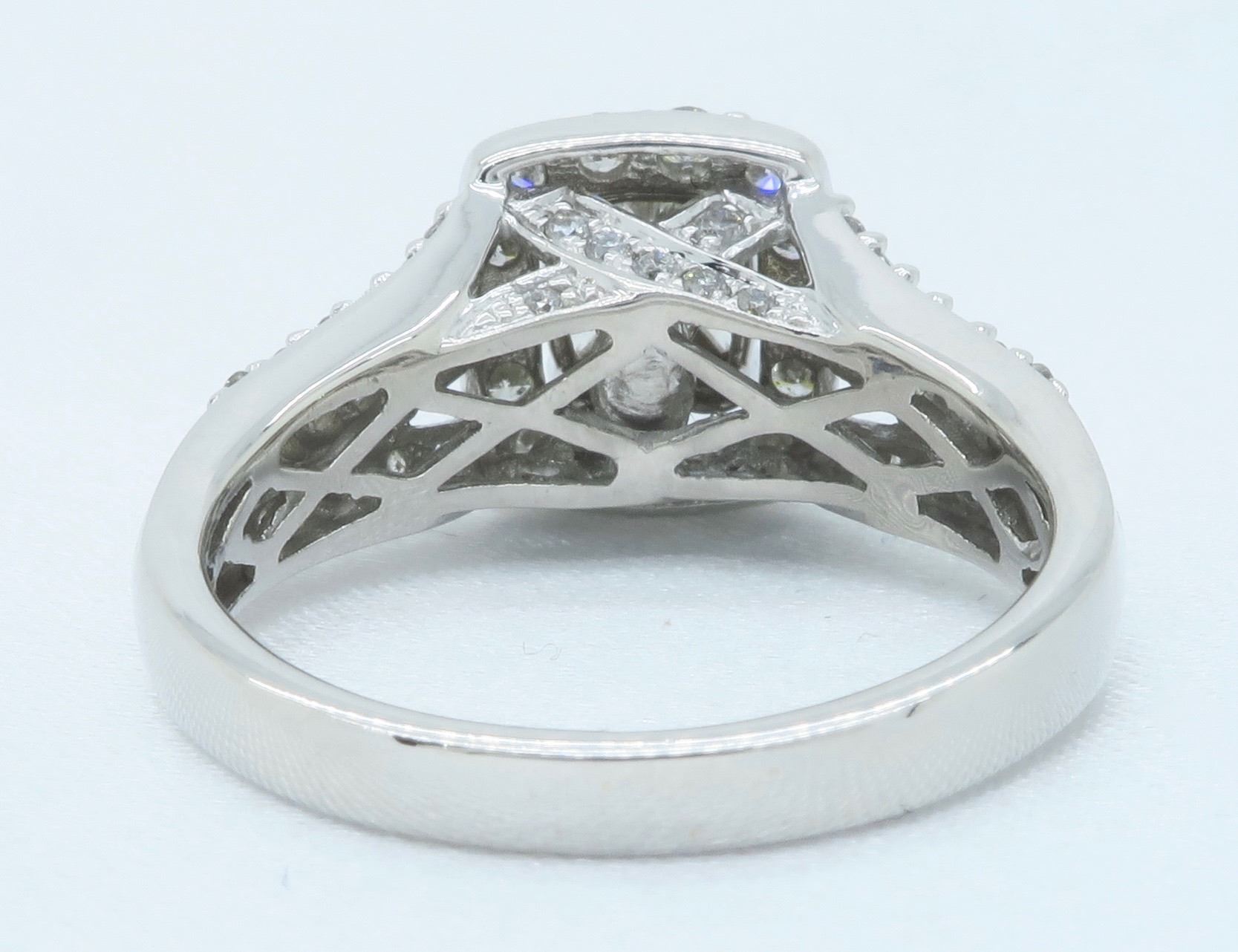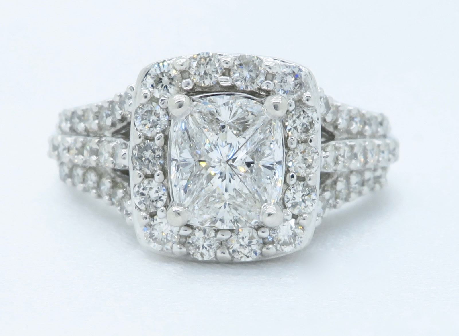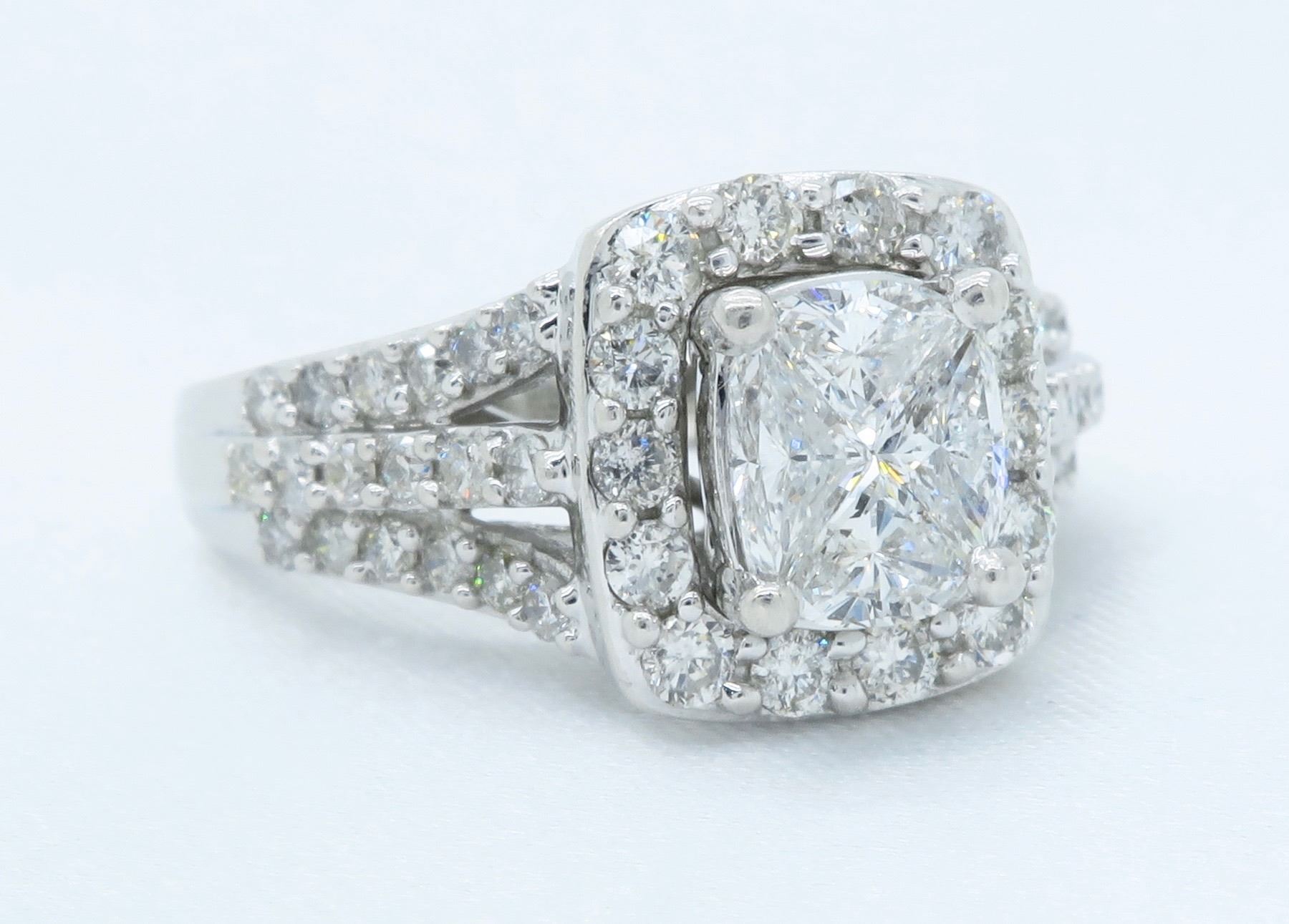 14KT White Gold 1.40ctw Diamond Ring. (4) Trilliant cut Diamonds and (64) round Diamonds with a total weight of 1.40cts with a color of G-I and clarity of SI-2 to I-1. Total weight of this ring is 5 grams. Ring size is 5.75.