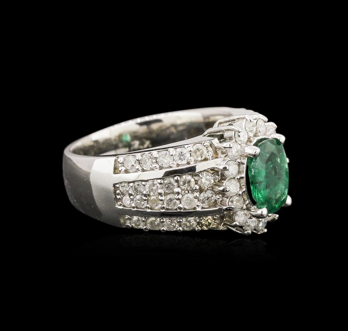 One electronically tested 14KT white gold ladies cast emerald and diamond ring with a bright polish finish. Identified with markings of "14K". Condition is very good. Containing: One prong set oval modified brilliant cut natural emerald, measuring 8.20 x 6.80 x 4.42mm, approximate total weight of 1.41ct., clarity is heavily included, type III, medium, moderately strong, green color, (GIA G 5/4)Sixty prong set round brilliant cut diamonds, measuring 1.90 - 1.30 x 0.96mm (depth est.) approximate total weight of 60 Stones = 0.89ct. Clarity: I-1 to I-2. Color: I - J. Colored gemstones are presumed to have been subjected to commonly used enhancement processes. All diamonds and colored gemstones are graded in the mounting, unless otherwise stated. Total Weight of Colored Stones 1.41ct. Total Weight of Diamonds 0.89ct. Total Weight of Ring 9.20 grams. GGL Appraised at $3,425.00.