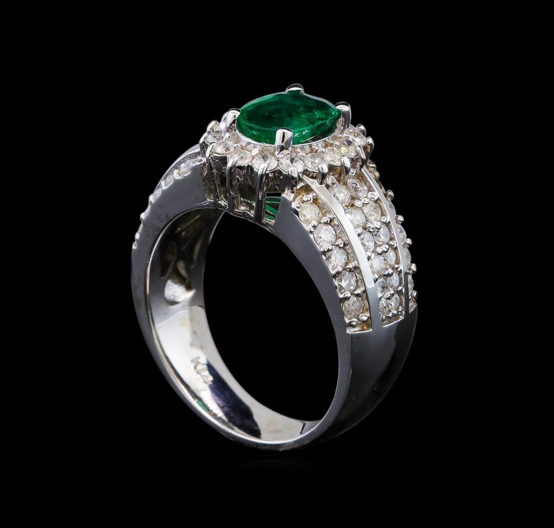 One electronically tested 14KT white gold ladies cast emerald and diamond ring with a bright polish finish. Identified with markings of "14K". Condition is very good. Containing: One prong set oval modified brilliant cut natural emerald, measuring 8.20 x 6.80 x 4.42mm, approximate total weight of 1.41ct., clarity is heavily included, type III, medium, moderately strong, green color, (GIA G 5/4)Sixty prong set round brilliant cut diamonds, measuring 1.90 - 1.30 x 0.96mm (depth est.) approximate total weight of 60 Stones = 0.89ct. Clarity: I-1 to I-2. Color: I - J. Colored gemstones are presumed to have been subjected to commonly used enhancement processes. All diamonds and colored gemstones are graded in the mounting, unless otherwise stated. Total Weight of Colored Stones 1.41ct. Total Weight of Diamonds 0.89ct. Total Weight of Ring 9.20 grams. GGL Appraised at $3,425.00.