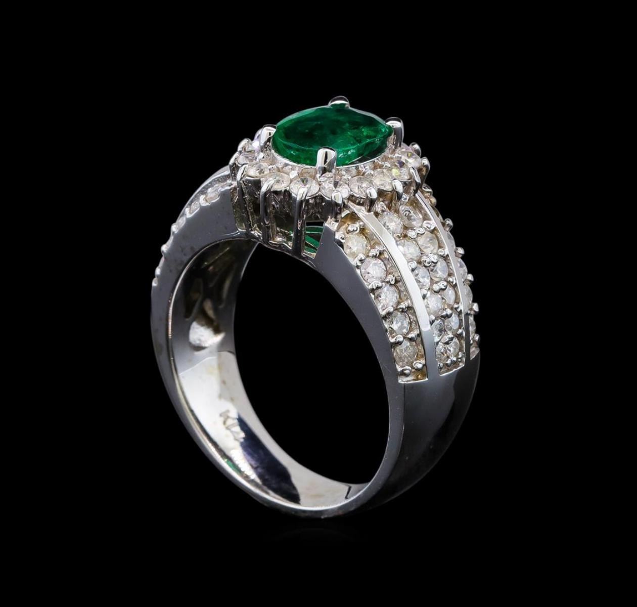 One electronically tested 14KT white gold ladies cast emerald and diamond ring with a bright polish finish. Identified with markings of "14K". Condition is very good. Containing: One prong set oval modified brilliant cut natural emerald, measuring 8.20 x 6.80 x 4.42mm, approximate total weight of 1.41ct., clarity is heavily included, type III, medium, moderately strong, green color, (GIA G 5/4)Sixty prong set round brilliant cut diamonds, measuring 1.90 - 1.30 x 0.96mm (depth est.) approximate total weight of 60 Stones = 0.89ct. Clarity: I-1 to I-2. Color: I - J. Colored gemstones are presumed to have been subjected to commonly used enhancement processes. All diamonds and colored gemstones are graded in the mounting, unless otherwise stated. Total Weight of Colored Stones 1.41ct. Total Weight of Diamonds 0.89ct. Total Weight of Ring 9.20 grams. GGL Appraised.