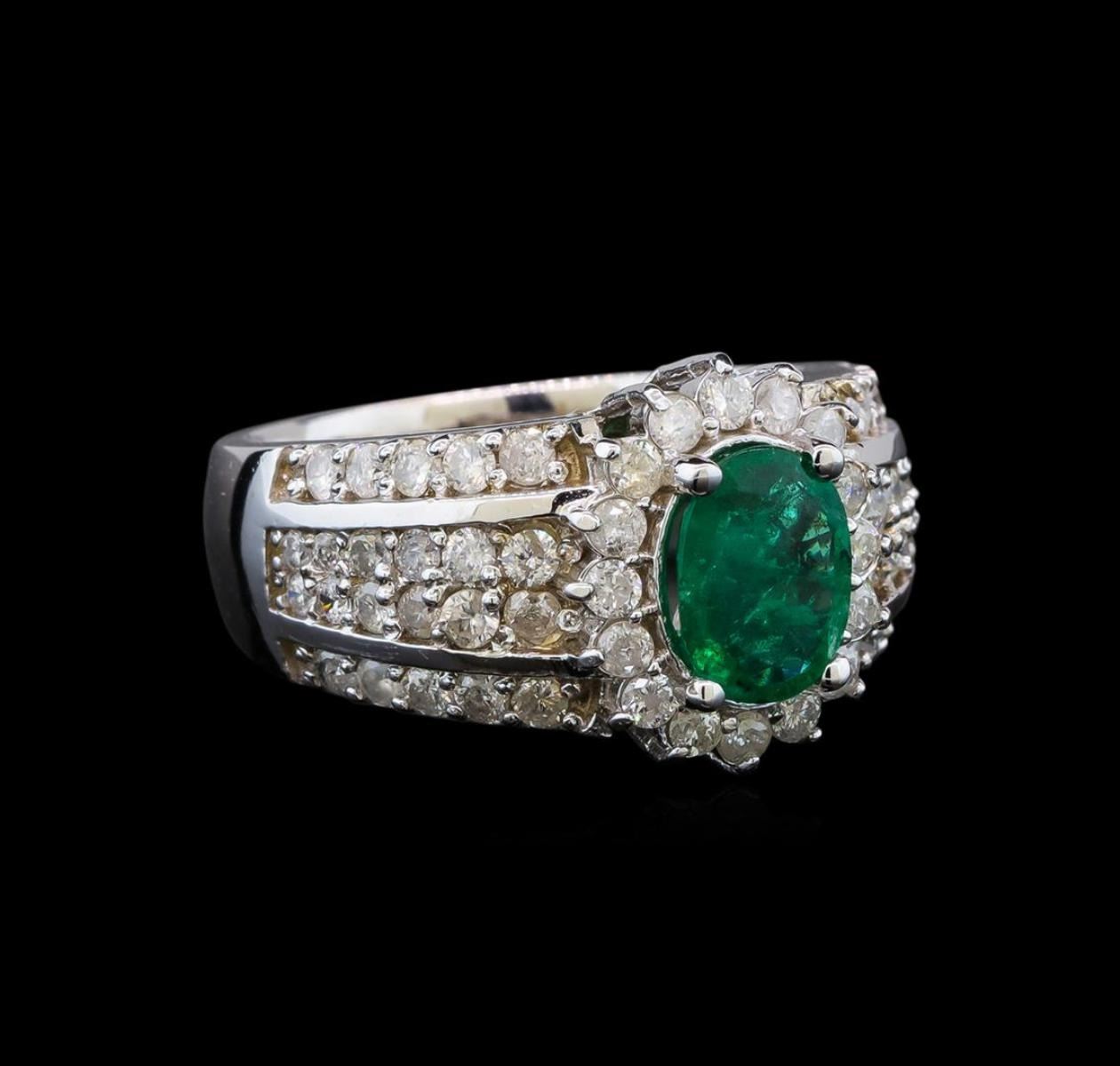 One electronically tested 14KT white gold ladies cast emerald and diamond ring with a bright polish finish. Identified with markings of "14K". Condition is very good. Containing: One prong set oval modified brilliant cut natural emerald, measuring 8.20 x 6.80 x 4.42mm, approximate total weight of 1.41ct., clarity is heavily included, type III, medium, moderately strong, green color, (GIA G 5/4)Sixty prong set round brilliant cut diamonds, measuring 1.90 - 1.30 x 0.96mm (depth est.) approximate total weight of 60 Stones = 0.89ct. Clarity: I-1 to I-2. Color: I - J. Colored gemstones are presumed to have been subjected to commonly used enhancement processes. All diamonds and colored gemstones are graded in the mounting, unless otherwise stated. Total Weight of Colored Stones 1.41ct. Total Weight of Diamonds 0.89ct. Total Weight of Ring 9.20 grams. GGL Appraised.