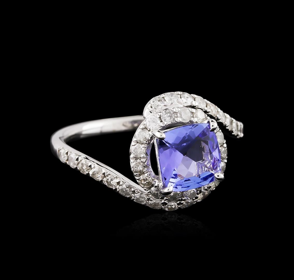 One electronically tested 14KT white gold ladies cast tanzanite and diamond ring with a bright polish finish. Identified with markings of "14K". Condition is new. Containing: One prong set square cushion modified brilliant cut natural tanzanite, measuring 6.50 x 6.50 x 4.23mm, approximate weight of 1.41ct., clarity is eye clean, type I, medium light, very slightly grayish, violet color, (GIA V 4/3), cut is good. Forty prong set round brilliant cut diamonds, measuring 1.30 - 1.30 x 0.78mm (depth est.) approximate total weight of 40 Stones = 0.70ct. Clarity: I-1 to I-2. Color: I - J. All diamonds and colored gemstones are graded in the mounting, unless otherwise stated. Colored gemstones are presumed to have been subjected to commonly used enhancement processes. Total Weight of Colored Stones 1.41ct. Total Weight of Diamonds 0.70ct. Total Weight of Ring 3.20 grams. GGL Appraised at $2,786.00.