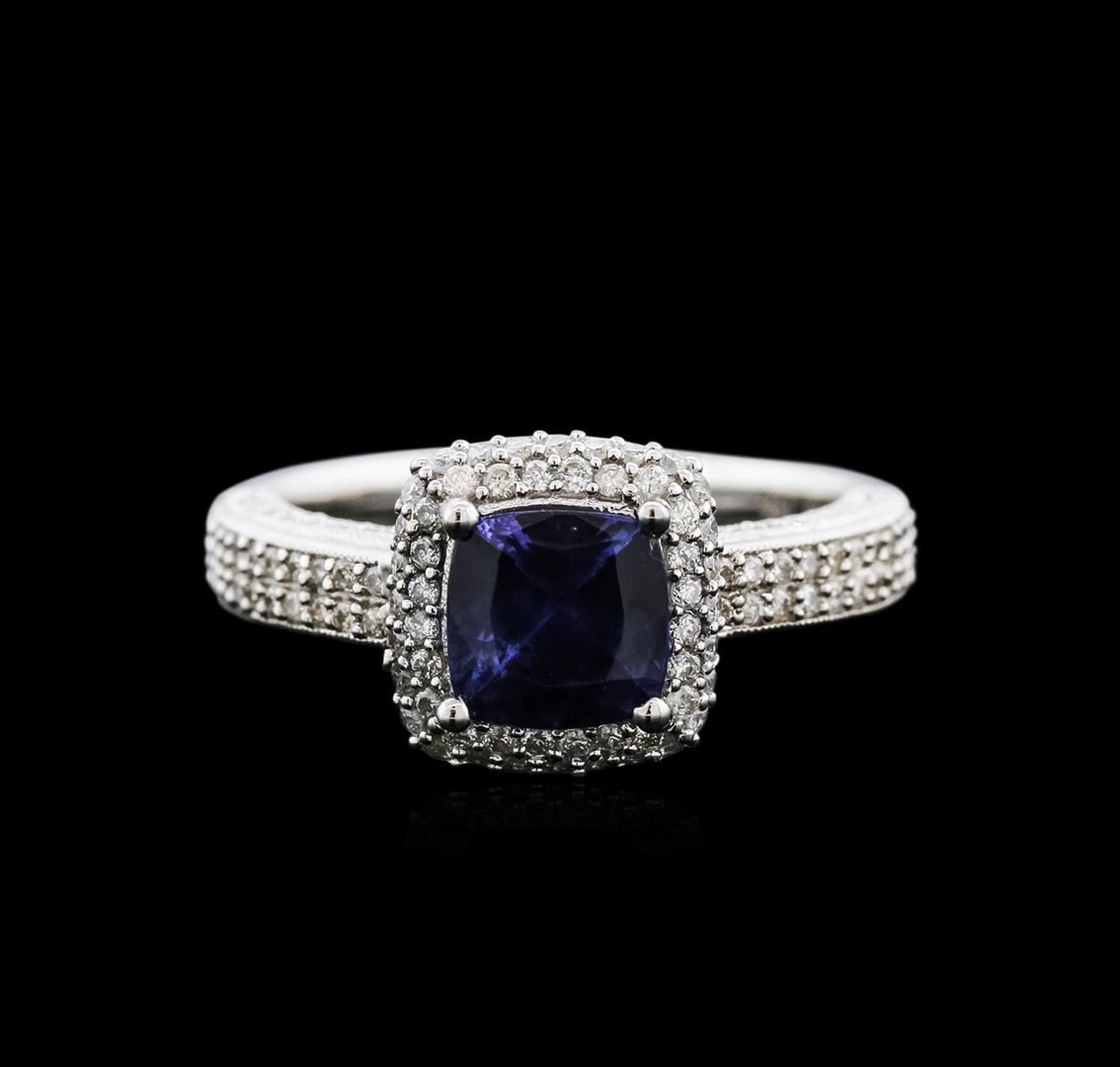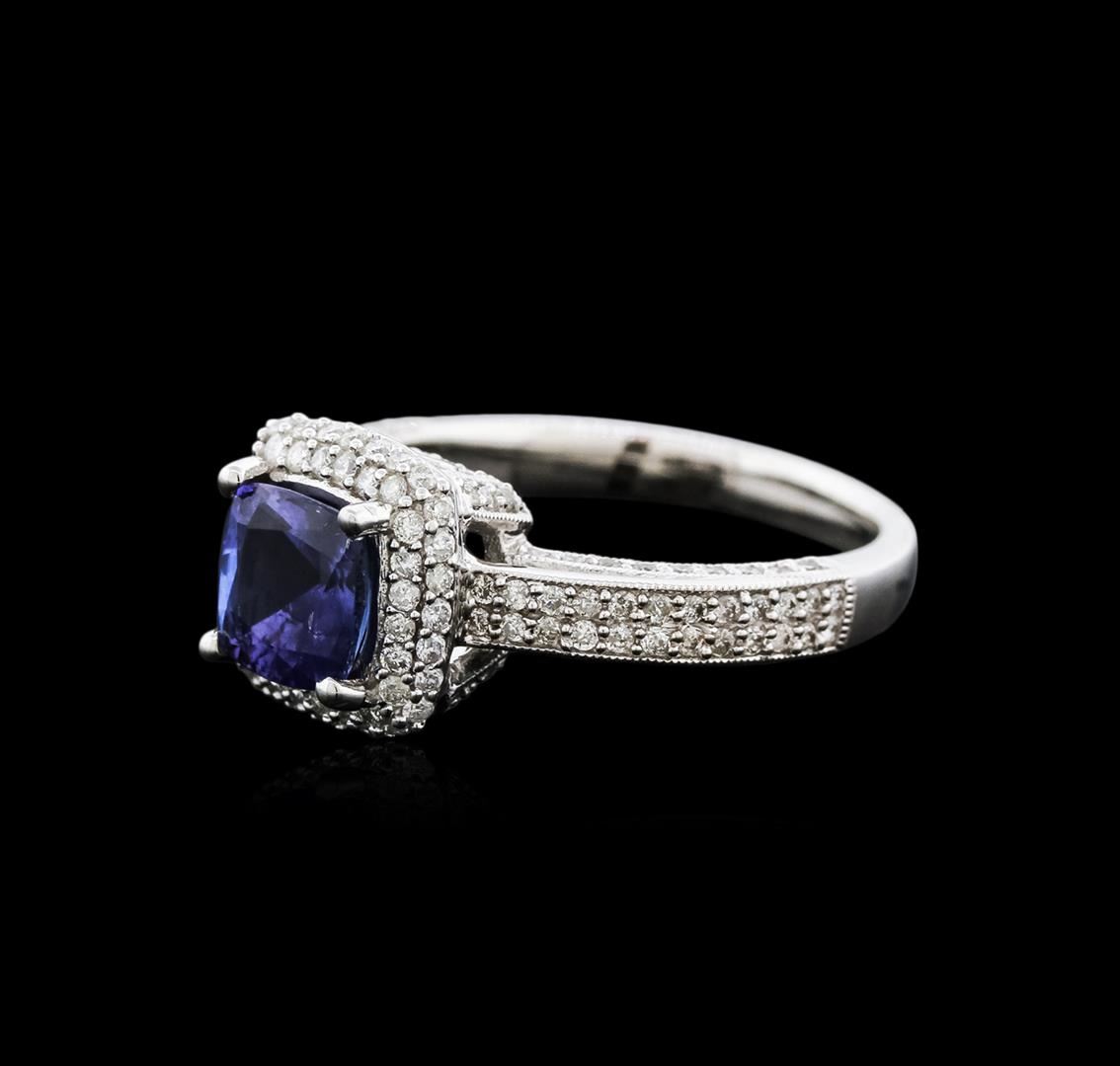 One electronically tested 14KT white gold ladies cast tanzanite and diamond ring with a bright polish finish. Identified with markings of "14K". Condition is new. Containing: One prong set square cushion modified brilliant cut natural tanzanite, measuring 6.50 x 6.50 x 4.23mm, approximate weight of 1.41ct., clarity is slightly included, type I, medium light, moderately strong, violet color, (GIA V 4/4), cut is good. One Hundred Fifty-Five prong set round brilliant cut diamonds, measuring 1.10 - 1.10 x 0.66mm (depth est.) approximate total weight of 155 Stones = 0.74ct. Clarity: SI-2 to I-2. Color: I - J. Colored gemstones are presumed to have been subjected to commonly used enhancement processes. All diamonds and colored gemstones are graded in the mounting, unless otherwise stated. Total Weight of Colored Stones 1.41ct. Total Weight of Diamonds 0.74ct. Total Weight of Ring 5.10 grams. GGL Appraised at $3,700.00.