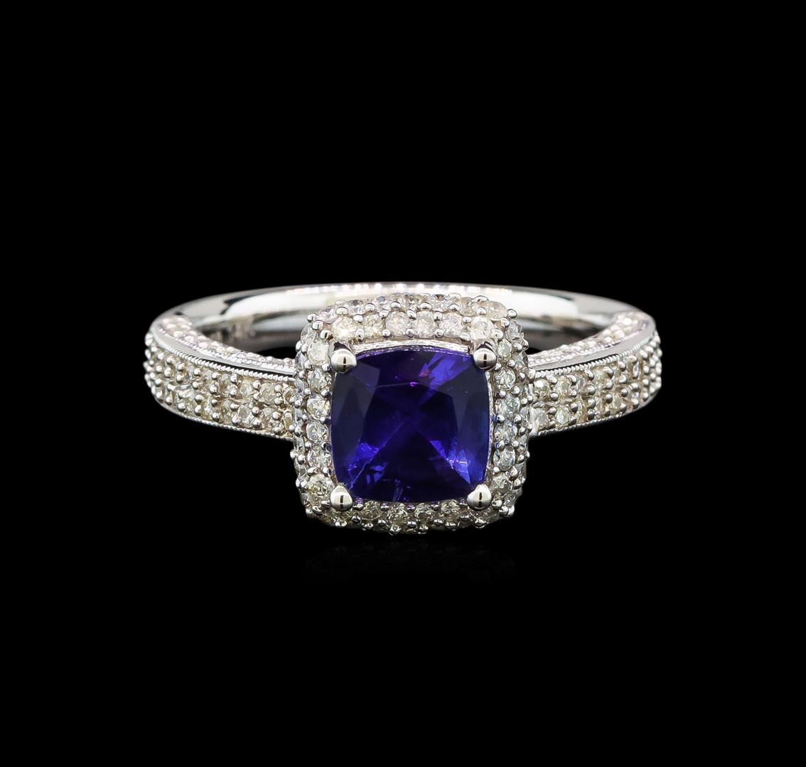 One electronically tested 14KT white gold ladies cast tanzanite and diamond ring with a bright polish finish. Identified with markings of "14K". Condition is new. Containing: One prong set square cushion modified brilliant cut natural tanzanite, measuring 6.50 x 6.50 x 4.23mm, approximate weight of 1.41ct., clarity is slightly included, type I, medium light, moderately strong, violet color, (GIA V 4/4), cut is good. One Hundred Fifty-Five prong set round brilliant cut diamonds, measuring 1.10 - 1.10 x 0.66mm (depth est.) approximate total weight of 155 Stones = 0.74ct. Clarity: SI-2 to I-2. Color: I - J. Colored gemstones are presumed to have been subjected to commonly used enhancement processes. All diamonds and colored gemstones are graded in the mounting, unless otherwise stated. Total Weight of Colored Stones 1.41ct. Total Weight of Diamonds 0.74ct. Total Weight of Ring 5.10 grams. GGL Appraised at $3,700.00.