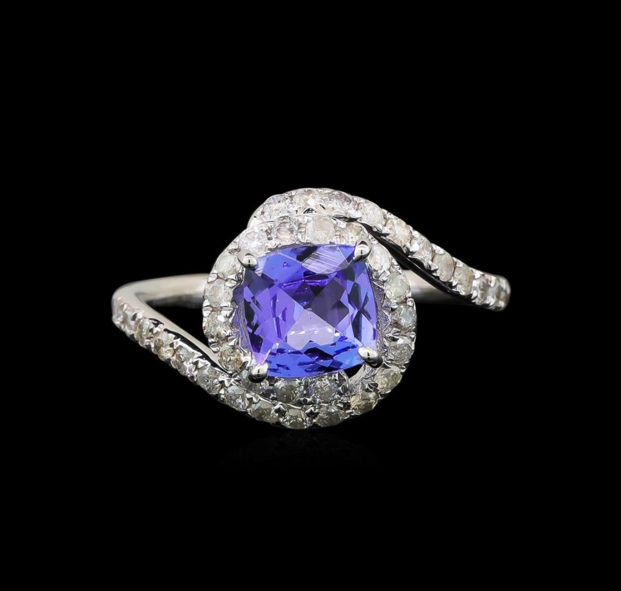 One electronically tested 14KT white gold ladies cast tanzanite and diamond ring with a bright polish finish. Identified with markings of "14K". Condition is new. Containing: One prong set square cushion modified brilliant cut natural tanzanite, measuring 6.50 x 6.50 x 4.23mm, approximate weight of 1.41ct., clarity is eye clean, type I, medium light, very slightly grayish, violet color, (GIA V 4/3), cut is good. Forty prong set round brilliant cut diamonds, measuring 1.30 - 1.30 x 0.78mm (depth est.) approximate total weight of 40 Stones = 0.70 ct. Clarity: I-1 to I-2. Color: I - J. All diamonds and colored gemstones are graded in the mounting, unless otherwise stated. Colored gemstones are presumed to have been subjected to commonly used enhancement processes. Total Weight of Colored Stones 1.41ct. Total Weight of Diamonds 0.70 ct. Total Weight of Ring 3.20 grams. GGL Appraised.