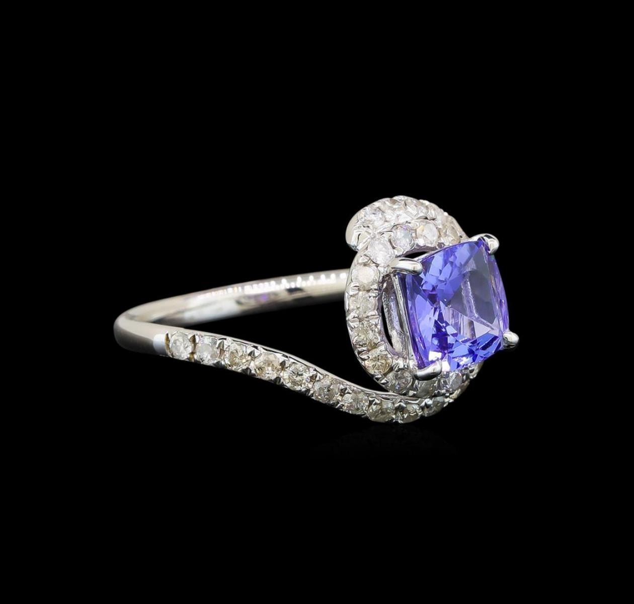 One electronically tested 14KT white gold ladies cast tanzanite and diamond ring with a bright polish finish. Identified with markings of "14K". Condition is new. Containing: One prong set square cushion modified brilliant cut natural tanzanite, measuring 6.50 x 6.50 x 4.23mm, approximate weight of 1.41ct., clarity is eye clean, type I, medium light, very slightly grayish, violet color, (GIA V 4/3), cut is good. Forty prong set round brilliant cut diamonds, measuring 1.30 - 1.30 x 0.78mm (depth est.) approximate total weight of 40 Stones = 0.70 ct. Clarity: I-1 to I-2. Color: I - J. All diamonds and colored gemstones are graded in the mounting, unless otherwise stated. Colored gemstones are presumed to have been subjected to commonly used enhancement processes. Total Weight of Colored Stones 1.41ct. Total Weight of Diamonds 0.70 ct. Total Weight of Ring 3.20 grams. GGL Appraised.