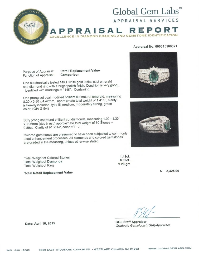 One electronically tested 14KT white gold ladies cast emerald and diamond ring with a bright polish finish. Identified with markings of "14K". Condition is very good. Containing: One prong set oval modified brilliant cut natural emerald, measuring 8.20 x 6.80 x 4.42mm, approximate total weight of 1.41ct., clarity is heavily included, type III, medium, moderately strong, green color, (GIA G 5/4)Sixty prong set round brilliant cut diamonds, measuring 1.90 - 1.30 x 0.96mm (depth est.) approximate total weight of 60 Stones = 0.89ct. Clarity: I-1 to I-2. Color: I - J. Colored gemstones are presumed to have been subjected to commonly used enhancement processes. All diamonds and colored gemstones are graded in the mounting, unless otherwise stated. Total Weight of Colored Stones 1.41ct. Total Weight of Diamonds 0.89ct. Total Weight of Ring 9.20 grams. GGL Appraised at $3,425.00.