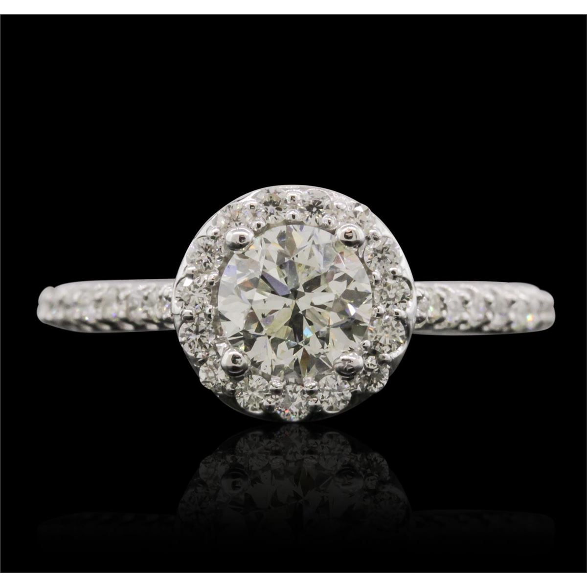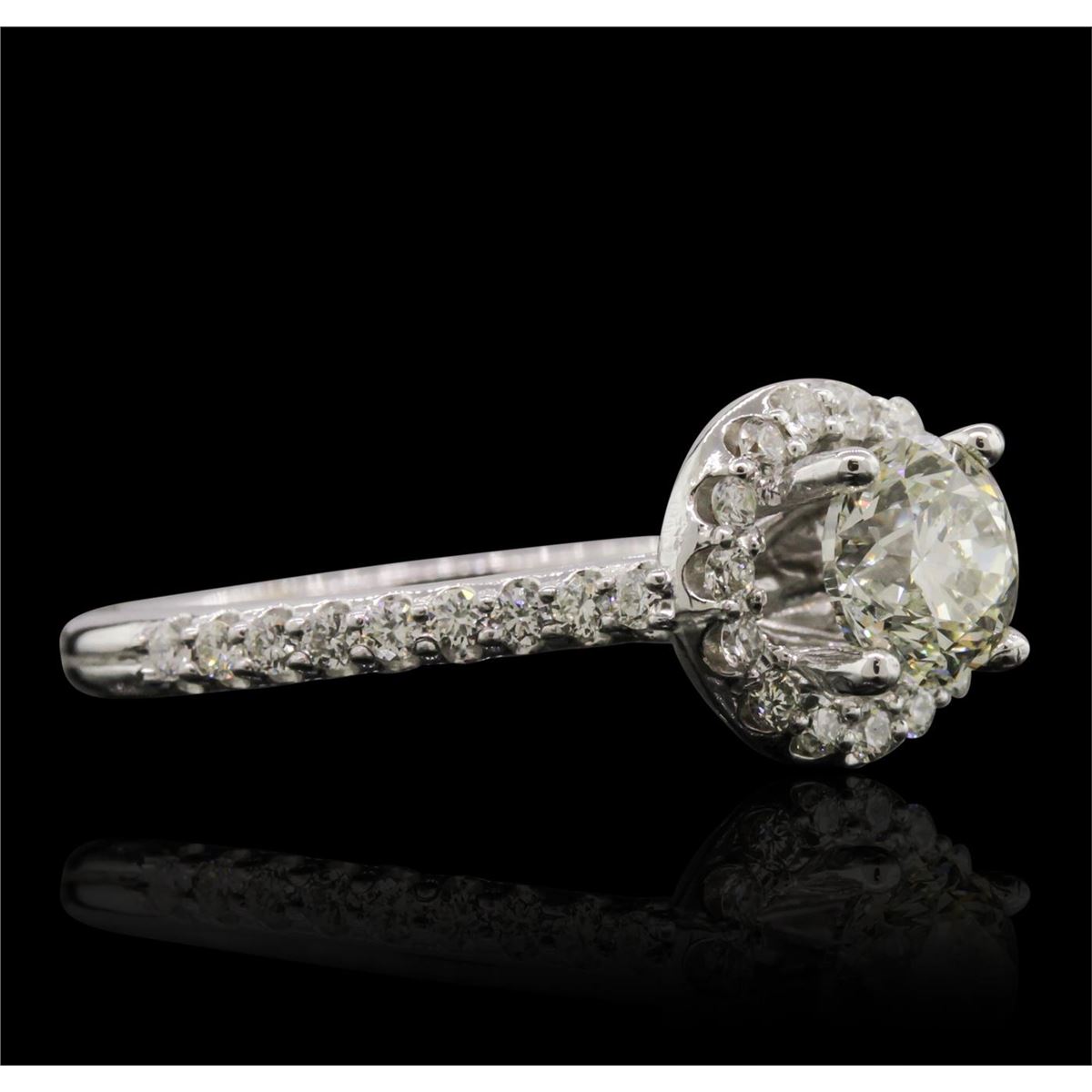 One electronically tested 14KT white gold Ladies combination cast & assembled engagement ring with a bright polish finish. Condition is new. Identified with markings of "14K". Containing: One prong set round brilliant cut diamond, measuring 5.96 - 5.90 x 4.00mm (depth est.) approximate. Total Weight of 1.02ct. Clarity: I-1. Color: H, Cut is Good. Thirty-Three prong set round brilliant cut diamonds, measuring 1.50 - 1.50 x 0.90mm (depth est.) approximate. Total Weight of 33 Stones = 0.41ct. Clarity: SI-1 to SI-3. Color: G - H, Cut is Good. EGL USA GEM ID# US 911348440D. All diamonds are graded in the mounting, unless otherwise stated. Total Weight of Diamonds 1.43ct. Total Weight of Engagement Ring 4.20 grams. GGL Appraised at $17,645.00.