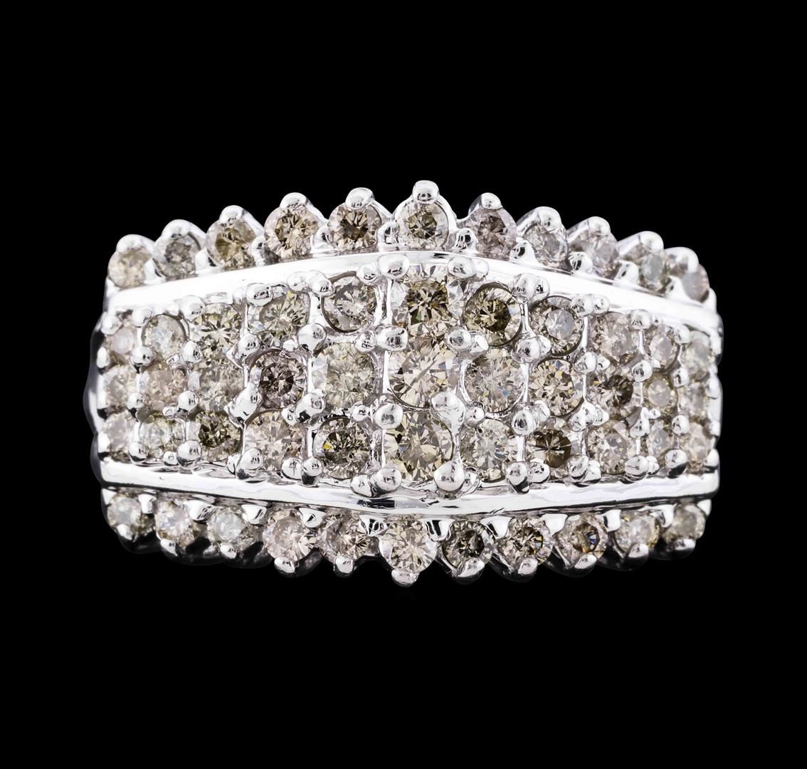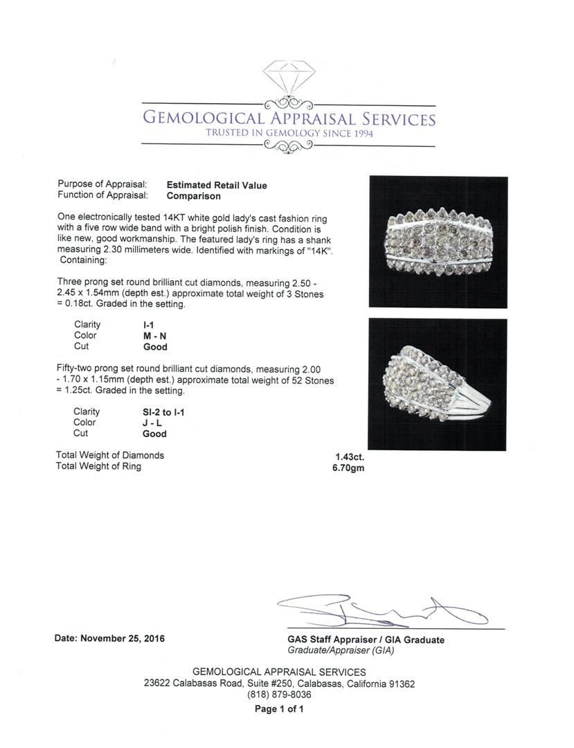 One electronically tested 14KT white gold lady's cast fashion ring with a five row wide band with a bright polish finish. The featured lady's ring has a shank measuring 2.30 millimeters wide. Identified with markings of "14K". Condition is like new, good workmanship. Containing: Three prong set round brilliant cut diamonds, measuring 2.50 - 2.45 x 1.54mm (depth est.) approximate total weight of 3 Stones = 0.18ct. Graded in the setting. Clarity: I-1. Color: M - NCut Good Fifty-Two prong set round brilliant cut diamonds, measuring 2.00 - 1.70 x 1.15mm (depth est.) approximate total weight of 52 Stones = 1.25ct. Graded in the setting. Clarity: SI-2 to I-1. Color: J - LCut Good. Total Weight of Diamonds 1.43ct. Total Weight of Ring 6.70gm. GAS Appraised.