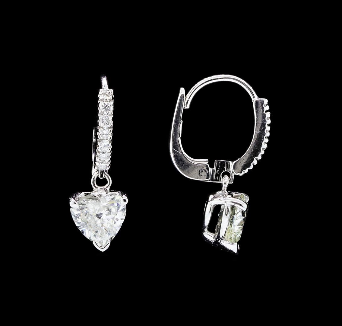 One pair electronically tested 14KT white gold lady's combination cast & assembled fashion earrings with hinged clip backs with a bright polish finish. Identified with markings of "14K". Condition is new, good workmanship. Containing: Two prong set heart shaped cut diamonds, measuring 5.60 x 6.30 x 3.18mm (depth est.) approximate total weight of 2 Stones = 1.32ct. Graded in the setting. Color J - K, Clarity I-1 to I-2 Cut Good Ten prong set round brilliant cut diamonds, measuring 1.50 - 1.40 x 0.90mm (depth est.) approximate total weight of 10 Stones = 0.12ct. Graded in the setting. Color H - I Clarity SI-1 to I-1 Cut Good. Total Weight of Diamonds 1.44ct. Total Weight of Earrings 2.60gm. GAS Appraised.