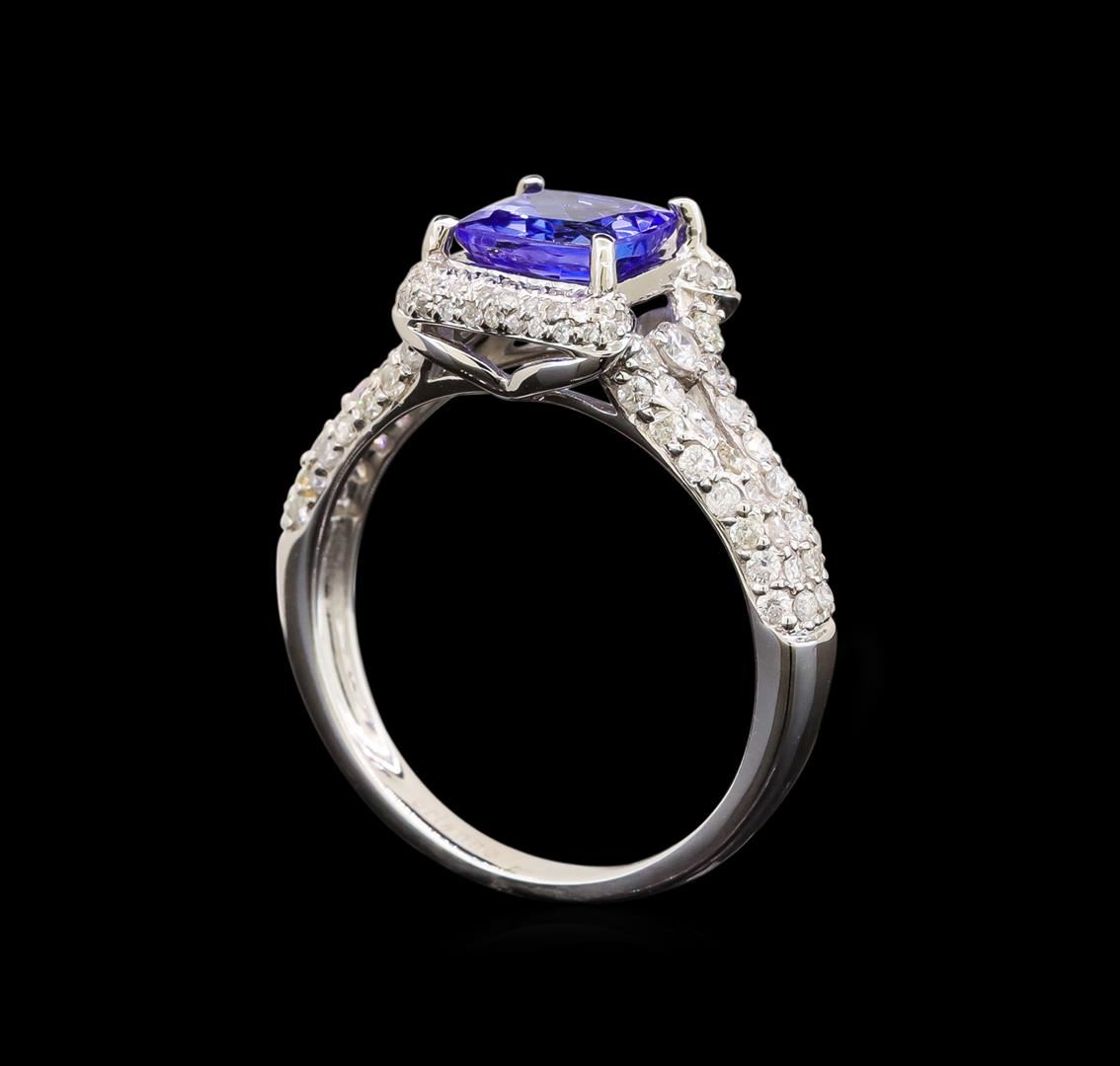 One electronically tested 14KT white gold ladies cast tanzanite and diamond ring with a flat shank with a bright polish finish. Trademark is Orianne. Identified with markings of "14K". Condition is new. Containing: One prong set square cushion modified brilliant cut natural tanzanite, measuring 6.60 x 6.50 x 4.26mm, approximate weight of 1.44ct., clarity is eye clean, type I, medium, very slightly grayish, violet color, (GIA V 5/3), cut is good. One Hundred Twenty-Two prong set round brilliant cut diamonds, measuring 1.80 - 1.10 x 0.87mm (depth est.) approximate total weight of 122 Stones = 0.50ct. Clarity: SI-2 to I-2. Color: I - J, Cut is Good. All diamonds and colored gemstones are graded in the mounting, unless otherwise stated. Colored gemstones are presumed to have been subjected to commonly used enhancement processes.. Total Weight of Colored Stones 1.44ct. Total Weight of Diamonds 0.50ct. Total Weight of Ring 3.30 grams. GGL Appraised at $3,400.00.