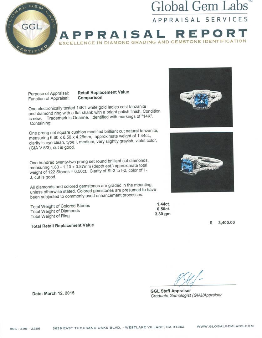 One electronically tested 14KT white gold ladies cast tanzanite and diamond ring with a flat shank with a bright polish finish. Trademark is Orianne. Identified with markings of "14K". Condition is new. Containing: One prong set square cushion modified brilliant cut natural tanzanite, measuring 6.60 x 6.50 x 4.26mm, approximate weight of 1.44ct., clarity is eye clean, type I, medium, very slightly grayish, violet color, (GIA V 5/3), cut is good. One Hundred Twenty-Two prong set round brilliant cut diamonds, measuring 1.80 - 1.10 x 0.87mm (depth est.) approximate total weight of 122 Stones = 0.50ct. Clarity: SI-2 to I-2. Color: I - J, Cut is Good. All diamonds and colored gemstones are graded in the mounting, unless otherwise stated. Colored gemstones are presumed to have been subjected to commonly used enhancement processes.. Total Weight of Colored Stones 1.44ct. Total Weight of Diamonds 0.50ct. Total Weight of Ring 3.30 grams. GGL Appraised at $3,400.00.