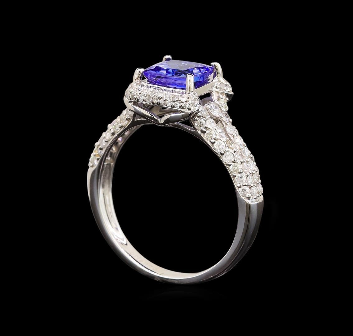 One electronically tested 14KT white gold ladies cast tanzanite and diamond ring with a flat shank with a bright polish finish. Trademark is Orianne. Identified with markings of "14K". Condition is new. Containing: One prong set square cushion modified brilliant cut natural tanzanite, measuring 6.60 x 6.50 x 4.26mm, approximate weight of 1.44ct., clarity is eye clean, type I, medium, very slightly grayish, violet color, (GIA V 5/3), cut is good. One Hundred Twenty-Two prong set round brilliant cut diamonds, measuring 1.80 - 1.10 x 0.87mm (depth est.) approximate total weight of 122 Stones = 0.50ct. Clarity: SI-2 to I-2. Color: I - J, Cut is Good. All diamonds and colored gemstones are graded in the mounting, unless otherwise stated. Colored gemstones are presumed to have been subjected to commonly used enhancement processes.. Total Weight of Colored Stones 1.44ct. Total Weight of Diamonds 0.50ct. Total Weight of Ring 3.30 grams. GGL Appraised.