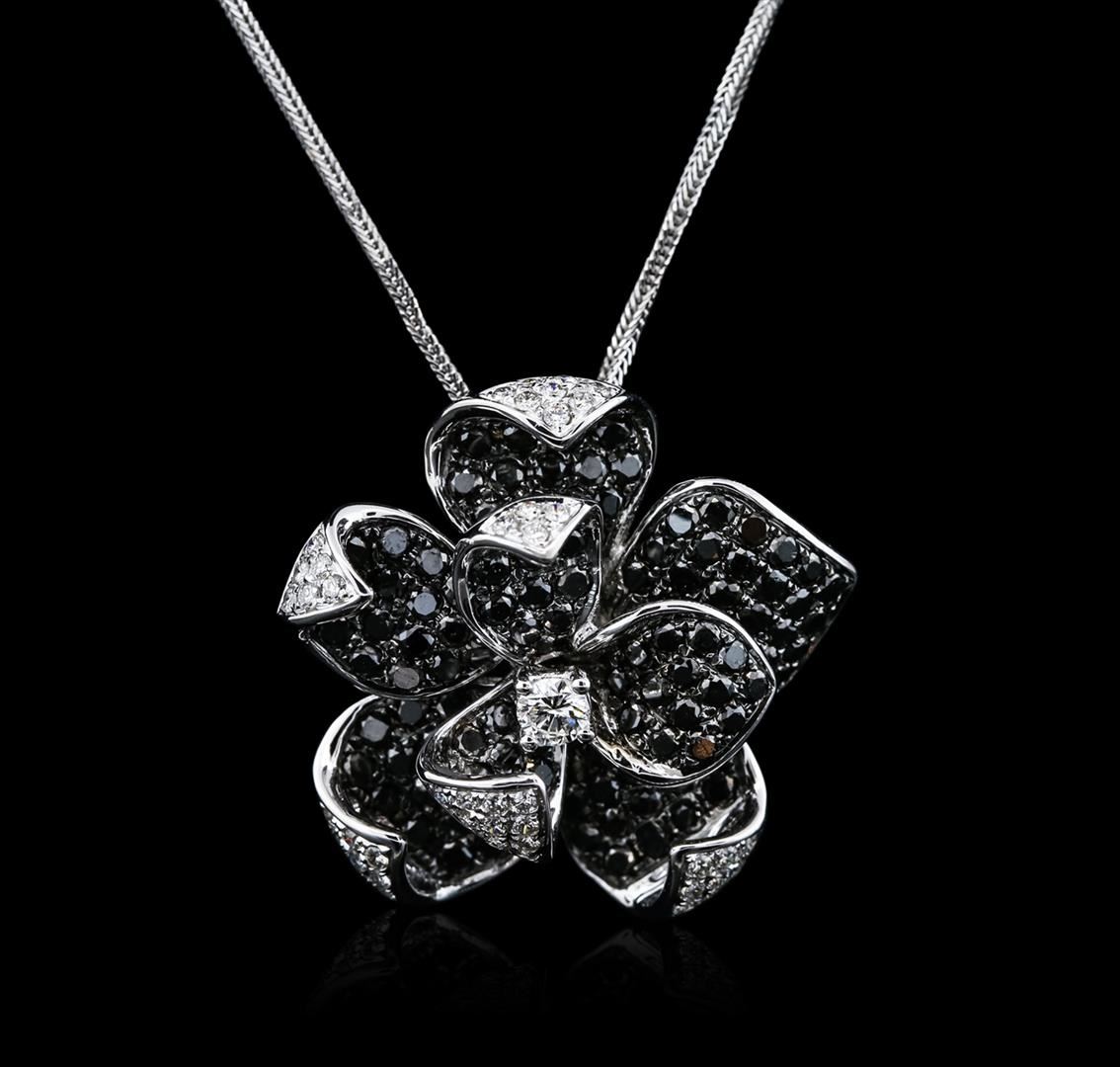 One electronically tested 14KT white gold ladies combination cast & assembled diamond pendant & chain 16.0" long, fancy link with a spring ring clasp with a bright polish finish. Identified with markings of "14K". Condition is new. Containing: One prong set round brilliant cut diamond, measuring 3.00. - 3.00. x 1.80mm (depth est.) approximate weight of 0.10ct. Clarity: SI-2. Color: J, Cut is Good. Forty-Four prong set round brilliant cut diamonds, measuring 1.30 - 1.30 x 0.78mm (depth est.) approximate total weight of 44 Stones = 0.35ct. Clarity: SI-1 to SI-2. Color: I - J, Cut is Good. One Hundred Twenty-Three prong set round brilliant cut diamonds, measuring 1.30 - 1.30 x 0.78mm (depth est.) approximate total weight of 123 Stones = 0.98ct. Cut is Good. All diamonds are graded in the mounting, unless otherwise stated. Total Weight of Diamonds 1.44ct. Total Weight of Pendant & Chain 9.10 grams. GGL Appraised at $4,945.00.