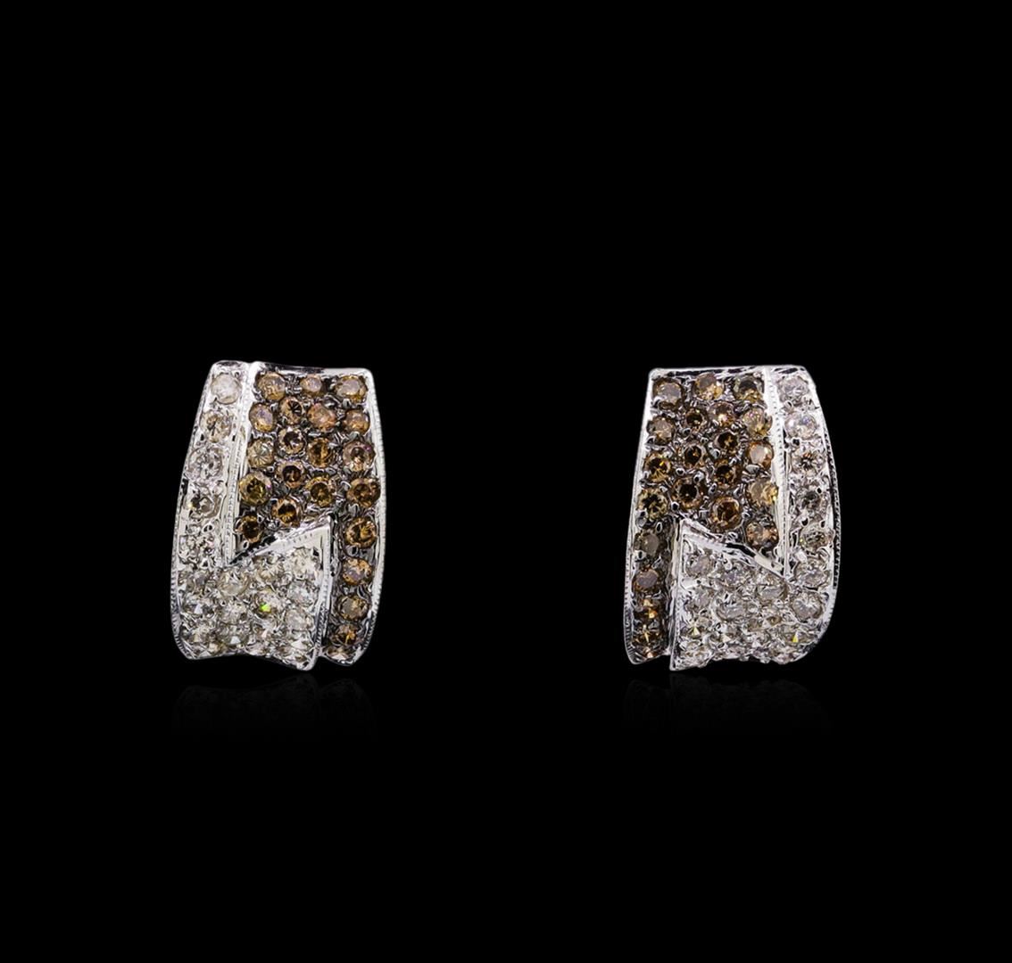 One pair electronically tested 14KT white gold ladies cast & assembled diamond earrings with omega backs. Condition is new, good workmanship. Bright and anodized finish with milgrain detailing throughout. Identified with markings of "14K". Containing: Forty-two bead set round brilliant cut diamonds, measuring 1.60 - 1.50 x 0.93mm (depth est.) approximate total weight of 42 Stones = 0.63ct. Faint brown secondary. Color throughout. Graded in the setting. Clarity SI-2 to I-1. Color H -- J. Forty-four bead set round brilliant cut diamonds, measuring 1.70 - 1.60 x 0.99mm (depth est.) approximate total weight of 44 Stones = 0.82ct. Graded in the setting. Clarity SI-2 to I-2. Color Fancy Brown. Total Weight of Diamonds 1.45ct. Total Weight of Earrings 6.20gm. AIG Appraised at $4,765.00.