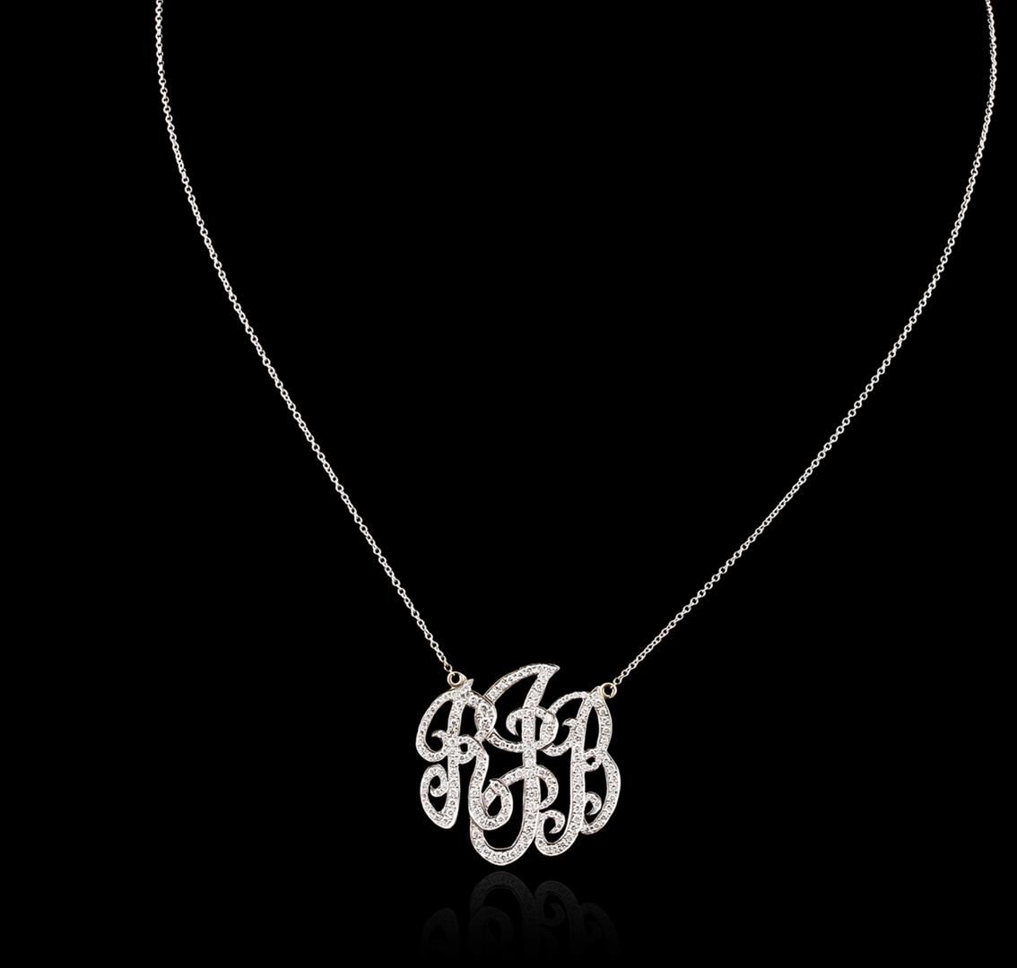 One electronically tested 14KT white gold ladies cast & assembled diamond monogram pendant with chain. The one inch wide monogram pendant features the diamond set letters "RJB" supported by an attached eighteen inch length 14KT white gold designer style chain, terminating in a spring ring clasp. Bright polish finish. Identified with markings of "14K". Condition is good. Containing: One Hundred Sixty-Nine prong set round brilliant cut diamonds, measuring 1.50 - 1.10 x 0.78mm (depth est.) approximate total weight of 169 Stones = 1.45ct. Graded in the setting. Clarity: VS-1 to SI-1. Color: G - I. Total Weight of Diamonds 1.45ct. Total Weight of Pendant With Chain 3.50 grams. AIG Appraised at $5,995.00.