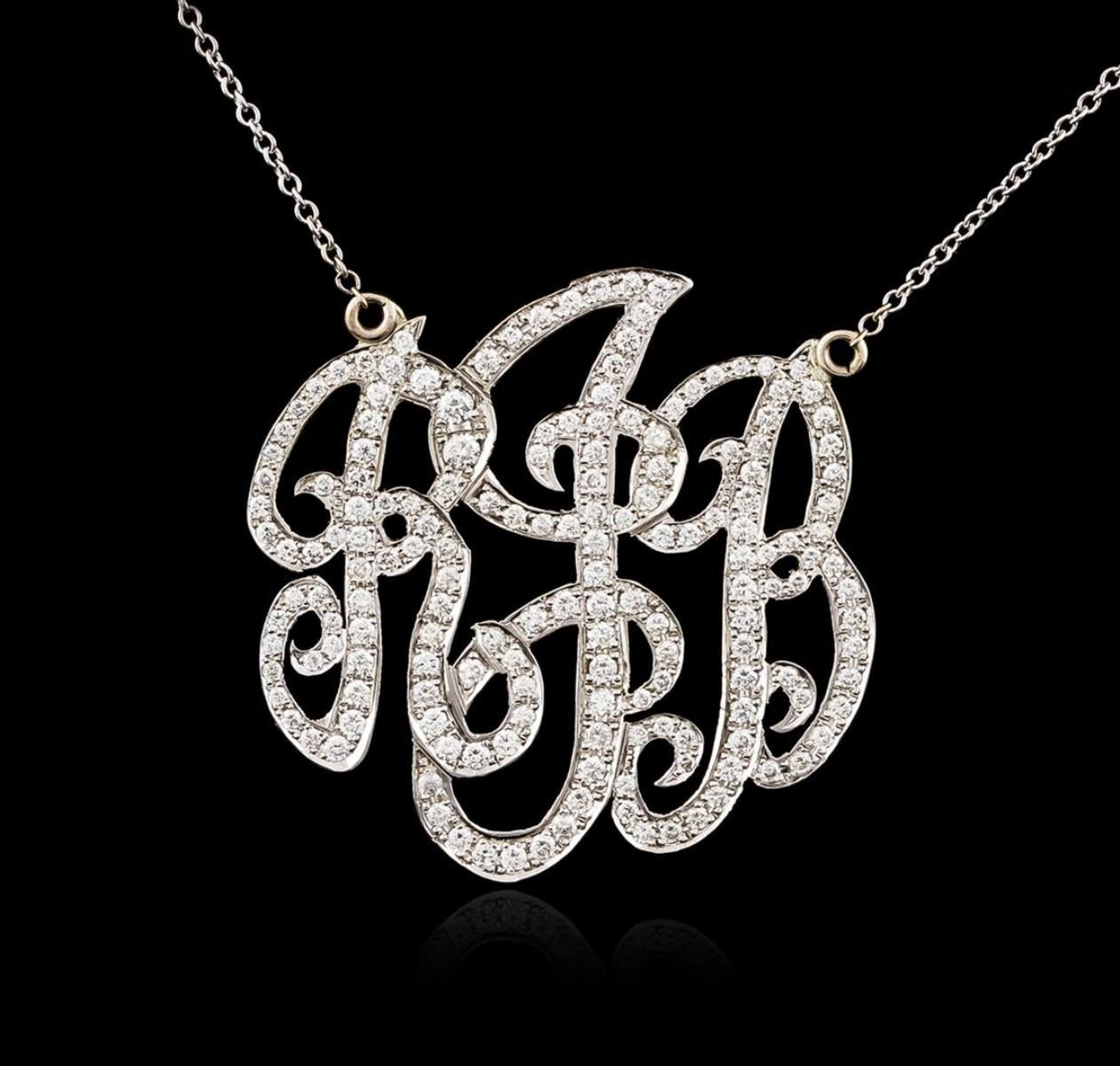 One electronically tested 14KT white gold ladies cast & assembled diamond monogram pendant with chain. The one inch wide monogram pendant features the diamond set letters "RJB" supported by an attached eighteen inch length 14KT white gold designer style chain, terminating in a spring ring clasp. Bright polish finish. Identified with markings of "14K". Condition is good. Containing: One Hundred Sixty-Nine prong set round brilliant cut diamonds, measuring 1.50 - 1.10 x 0.78mm (depth est.) approximate total weight of 169 Stones = 1.45ct. Graded in the setting. Clarity: VS-1 to SI-1. Color: G - I. Total Weight of Diamonds 1.45ct. Total Weight of Pendant With Chain 3.50 grams. AIG Appraised.