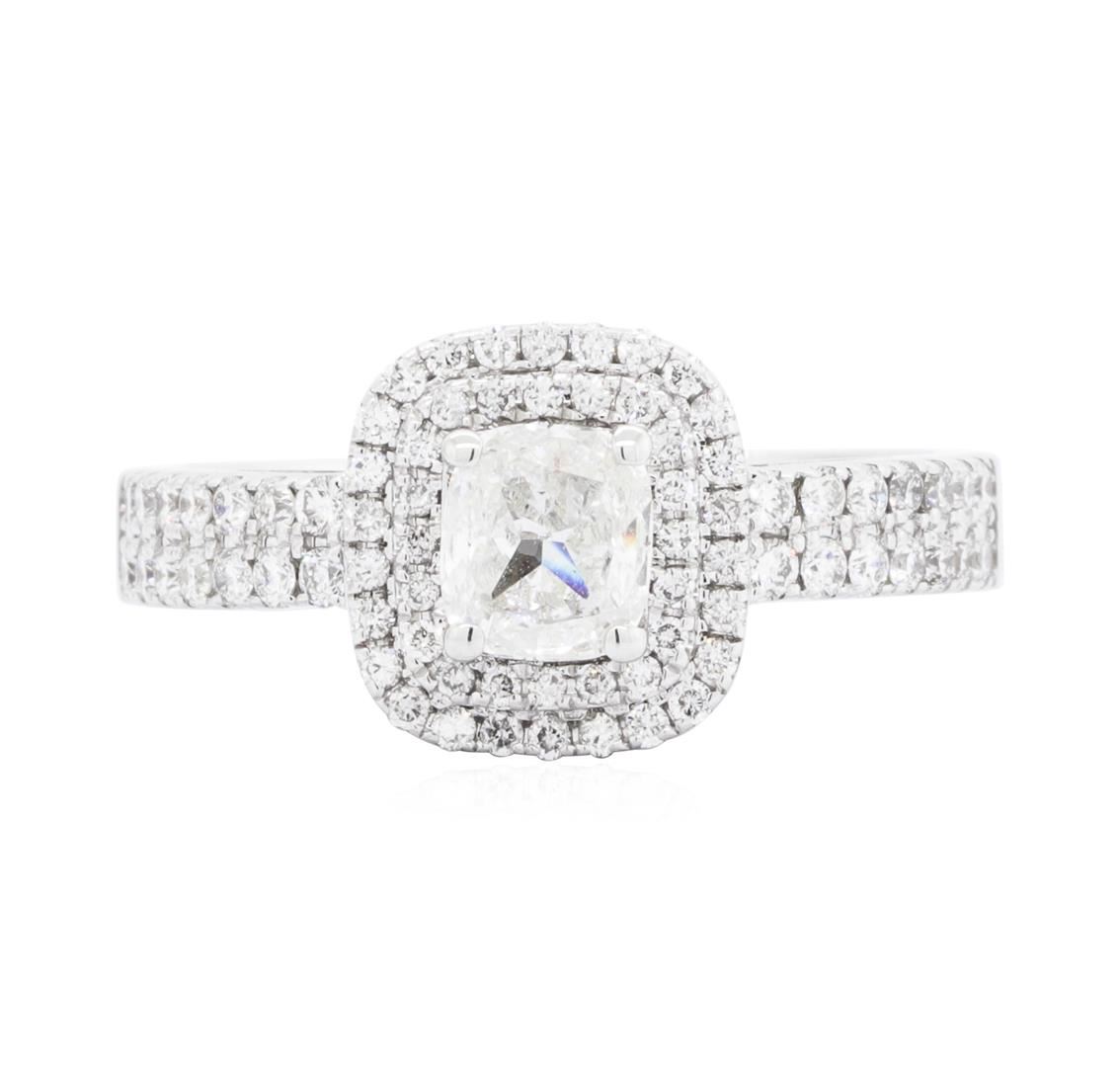 One electronically tested 14KT white gold Ladies cast wedding ring with a double basket halo with a bright polish finish. The featured Ladies ring has a shank measuring 3.53 millimeters wide. Identified with markings of '14K'. Condition is new, good workmanship. Containing: One prong set cushion cut diamond, measuring 5.93 x 5.24 x 3.23mm (depth est.) approximate weight of 0.85ct. Graded in the setting. Color J - K Clarity I-1 Cut Good Twenty-Eight prong set round brilliant cut diamonds, measuring 1.60 - 1.50 x 0.96mm (depth est.) approximate total weight of 28 Stones = 0.40ct. Graded in the setting. Color H - I Clarity SI-1 to SI-2 Cut Good Forty-Six prong set round brilliant cut diamonds, measuring 1.10 - 1.00 x 0.65mm (depth est.) approximate total weight of 46 Stones = 0.20ct. Graded in the setting. Color H - I Clarity SI-1 to I-1 Cut Good. Total Weight of Diamonds 1.45ct. Total Weight of Ring 7.60gm. GAS Appraised.