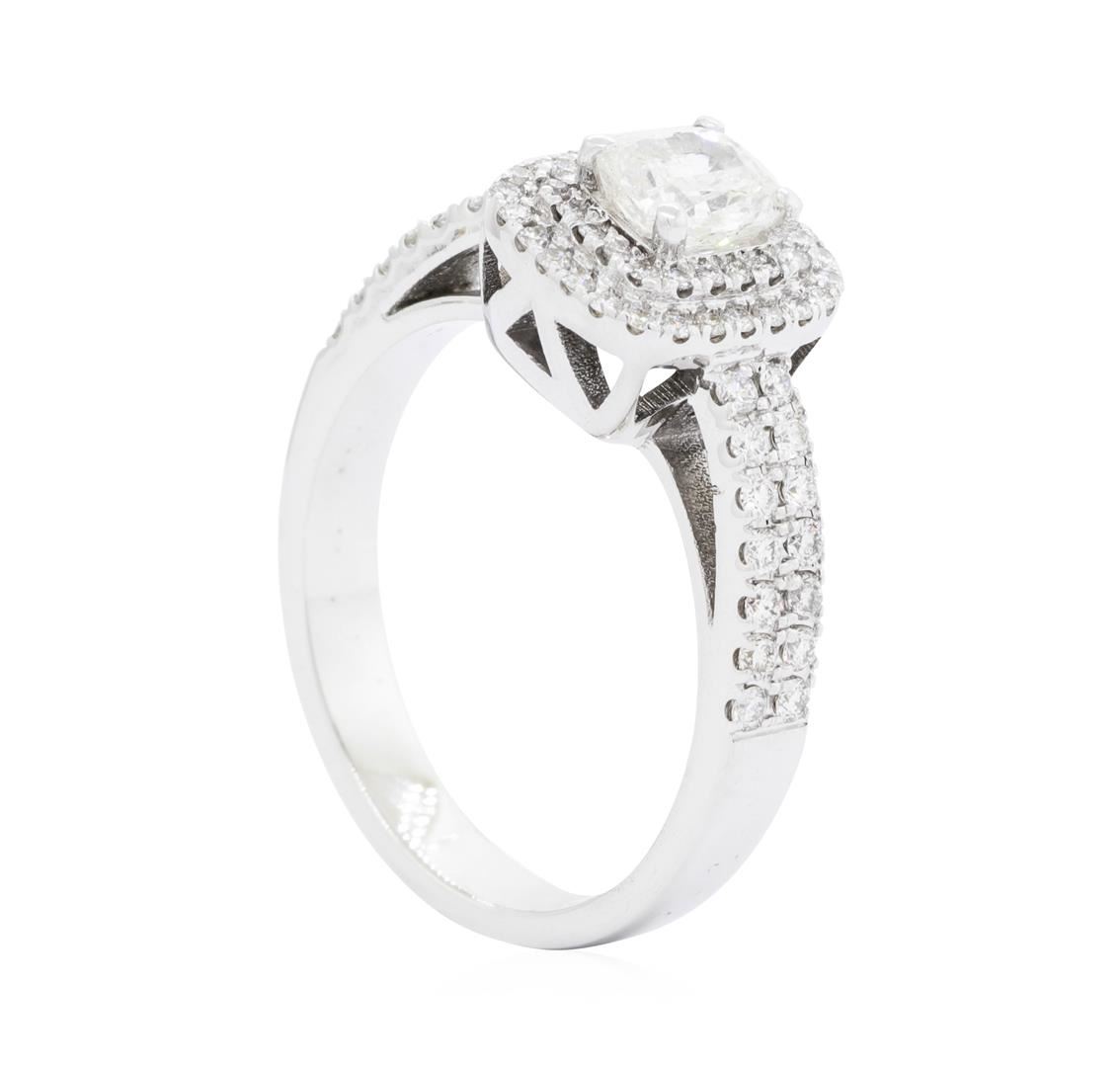 One electronically tested 14KT white gold Ladies cast wedding ring with a double basket halo with a bright polish finish. The featured Ladies ring has a shank measuring 3.53 millimeters wide. Identified with markings of '14K'. Condition is new, good workmanship. Containing: One prong set cushion cut diamond, measuring 5.93 x 5.24 x 3.23mm (depth est.) approximate weight of 0.85ct. Graded in the setting. Color J - K Clarity I-1 Cut Good Twenty-Eight prong set round brilliant cut diamonds, measuring 1.60 - 1.50 x 0.96mm (depth est.) approximate total weight of 28 Stones = 0.40ct. Graded in the setting. Color H - I Clarity SI-1 to SI-2 Cut Good Forty-Six prong set round brilliant cut diamonds, measuring 1.10 - 1.00 x 0.65mm (depth est.) approximate total weight of 46 Stones = 0.20ct. Graded in the setting. Color H - I Clarity SI-1 to I-1 Cut Good. Total Weight of Diamonds 1.45ct. Total Weight of Ring 7.60gm. GAS Appraised.