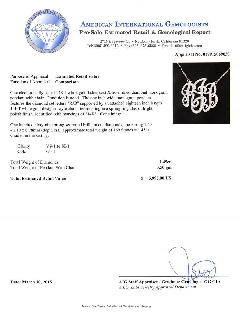 One electronically tested 14KT white gold ladies cast & assembled diamond monogram pendant with chain. The one inch wide monogram pendant features the diamond set letters "RJB" supported by an attached eighteen inch length 14KT white gold designer style chain, terminating in a spring ring clasp. Bright polish finish. Identified with markings of "14K". Condition is good. Containing: One Hundred Sixty-Nine prong set round brilliant cut diamonds, measuring 1.50 - 1.10 x 0.78mm (depth est.) approximate total weight of 169 Stones = 1.45ct. Graded in the setting. Clarity: VS-1 to SI-1. Color: G - I. Total Weight of Diamonds 1.45ct. Total Weight of Pendant With Chain 3.50 grams. AIG Appraised at $5,995.00.