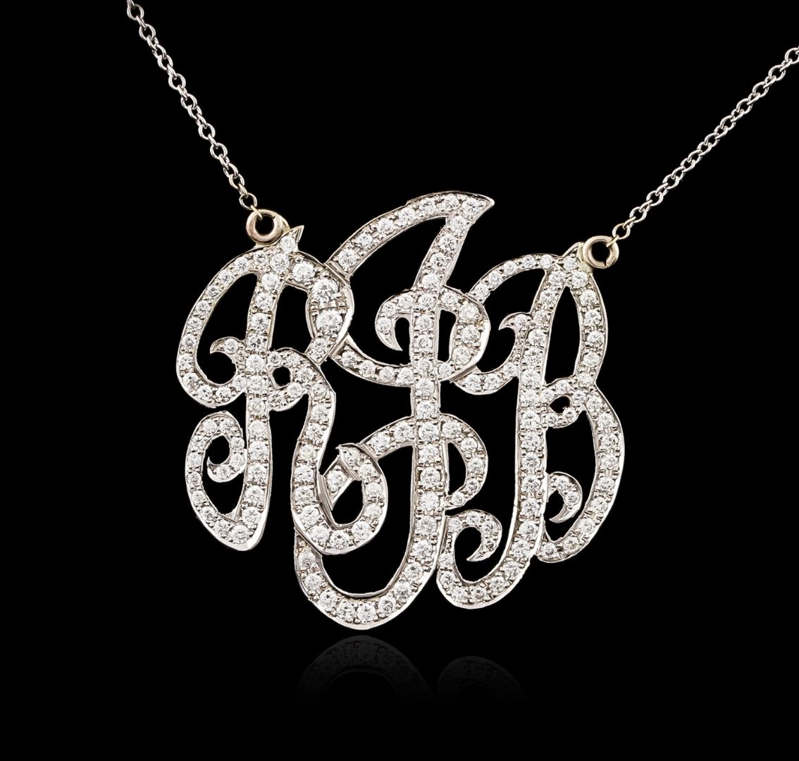 One electronically tested 14KT white gold ladies cast & assembled diamond monogram pendant with chain. The one inch wide monogram pendant features the diamond set letters "RJB" supported by an attached eighteen inch length 14KT white gold designer style chain, terminating in a spring ring clasp. Bright polish finish. Identified with markings of "14K". Condition is good. Containing: One Hundred Sixty-Nine prong set round brilliant cut diamonds, measuring 1.50 - 1.10 x 0.78mm (depth est.) approximate total weight of 169 Stones = 1.45ct. Graded in the setting. Clarity: VS-1 to SI-1. Color: G - I. Total Weight of Diamonds 1.45ct. Total Weight of Pendant With Chain 3.50 grams. AIG Appraised at $5,995.00.