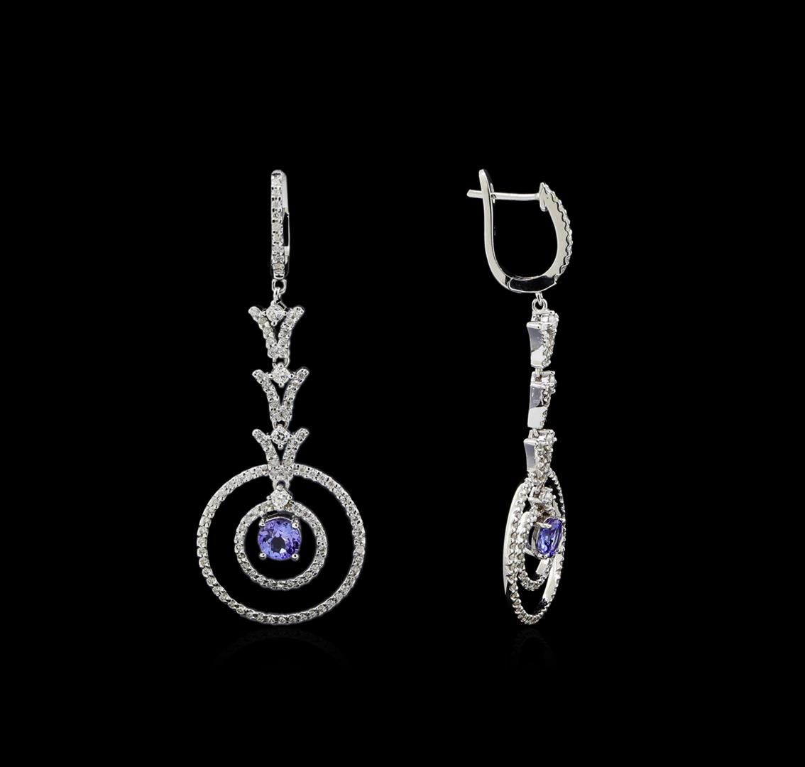 One pair electronically tested 14KT white gold ladies cast tanzanite and diamond earrings with hinged clip backs with a bright polish finish. Identified with markings of "14K". Condition is new. Containing: Two prong set round modified brilliant cut natural tanzanites, measuring 5.50 - 5.50 x 3.58 mm, approximate total weight of 1.46ct., clarity is eye clean, type I, medium light, very slightly grayish, violet color, (GIA V 4/3), cut is good. Two Hundred Ten prong set round brilliant cut diamonds, measuring 1.30 - 1.30 x 0.78mm (depth est.) approximate total weight of 210 Stones = 1.68ct. Clarity of I-1 to I-2, Color of I - J, Cut is Good. Eight prong set round brilliant cut diamonds, measuring 2.30 - 2.30 x 1.38mm (depth est.) approximate total weight of 8 Stones = 0.36ct. Clarity of SI-1 to I-1, Color of I - J, Cut is Good. Colored gemstones are presumed to have been subjected to commonly used enhancement processes. All diamonds and colored gemstones are graded in the mounting, unless otherwise stated. Total Weight of Colored Stones 1.46ct. Total Weight of Diamonds 2.04ct. Total Weight of Earrings 12.10 grams. GGL Appraised at $5,200.00.