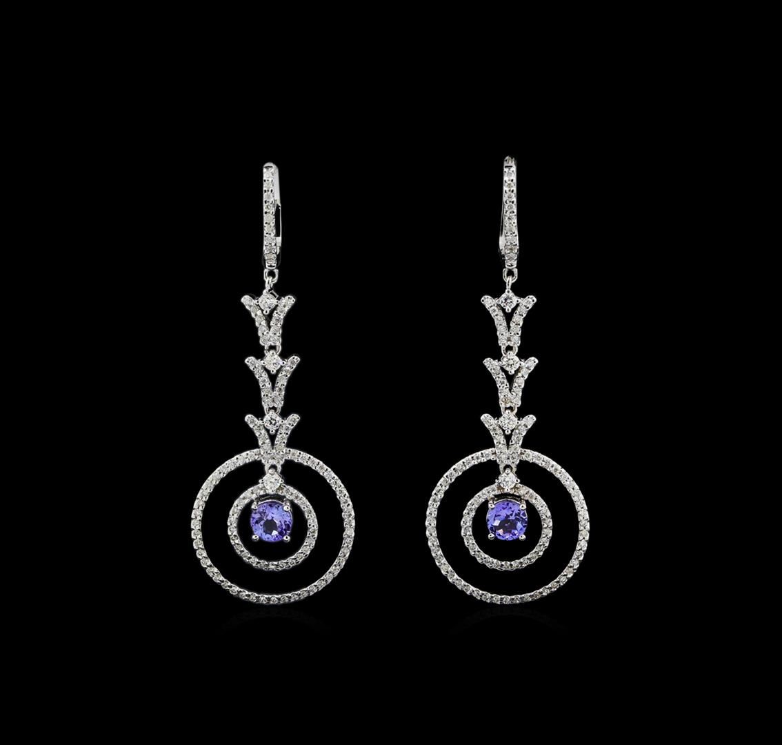 One pair electronically tested 14KT white gold ladies cast tanzanite and diamond earrings with hinged clip backs with a bright polish finish. Identified with markings of "14K". Condition is new. Containing: Two prong set round modified brilliant cut natural tanzanites, measuring 5.50 - 5.50 x 3.58 mm, approximate total weight of 1.46ct., clarity is eye clean, type I, medium light, very slightly grayish, violet color, (GIA V 4/3), cut is good. Two Hundred Ten prong set round brilliant cut diamonds, measuring 1.30 - 1.30 x 0.78mm (depth est.) approximate total weight of 210 Stones = 1.68ct. Clarity of I-1 to I-2, Color of I - J, Cut is Good. Eight prong set round brilliant cut diamonds, measuring 2.30 - 2.30 x 1.38mm (depth est.) approximate total weight of 8 Stones = 0.36ct. Clarity of SI-1 to I-1, Color of I - J, Cut is Good. Colored gemstones are presumed to have been subjected to commonly used enhancement processes. All diamonds and colored gemstones are graded in the mounting, unless otherwise stated. Total Weight of Colored Stones 1.46ct. Total Weight of Diamonds 2.04ct. Total Weight of Earrings 12.10 grams. GGL Appraised at $5,200.00.