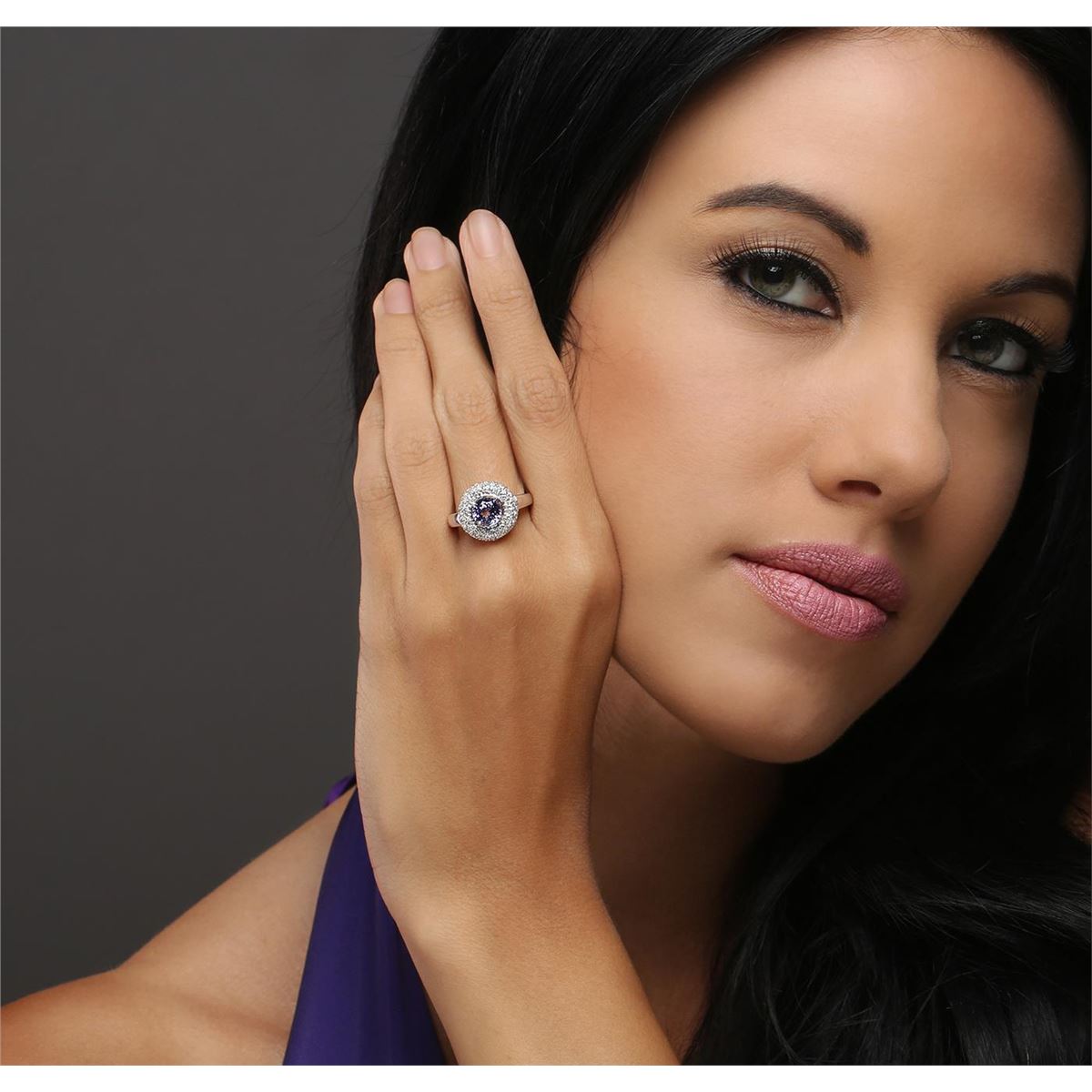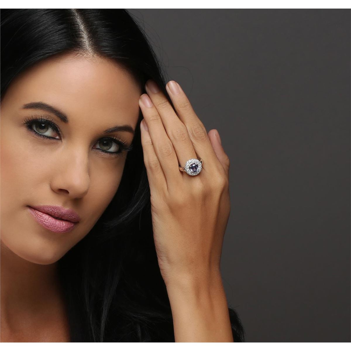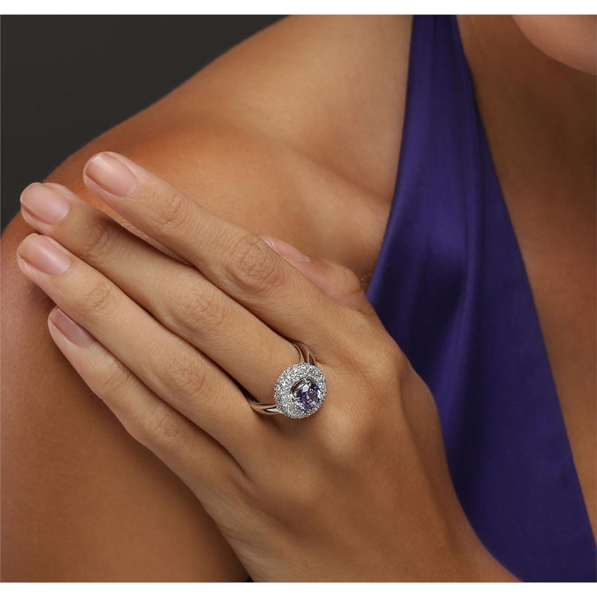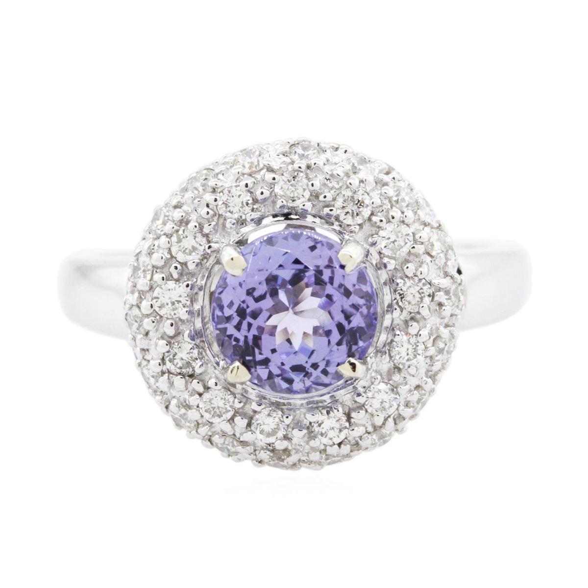 One electronically tested 14KT white gold ladies combination cast & assembled tanzanite and diamond ring with a flat shank with a bright polish finish. Identified with markings of "14K". Condition is new. Containing: One prong set round modified brilliant cut natural tanzanite, measuring 6.96 - 6.90 x 4.50 mm, approximate weight of 1.46ct., clarity is eye clean, type I, medium, very slightly grayish, violet color, (GIA V 5/3), cut is good. Sixty-Six bead set round brilliant cut diamonds, measuring 1.30 - 1.30 x 0.78mm (depth est.) approximate total weight of 66 Stones = 0.53ct. Clarity: SI-1 to I-1. Color: I - J, Cut is Good. Colored gemstones are presumed to have been subjected to commonly used enhancement processes. All diamonds and colored gemstones are graded in the mounting, unless otherwise stated. Total Weight of Colored Stones 1.46ct. Total Weight of Diamonds 0.53ct. Total Weight of Ring 6.10 grams. GGL Appraised at $5,585.00.