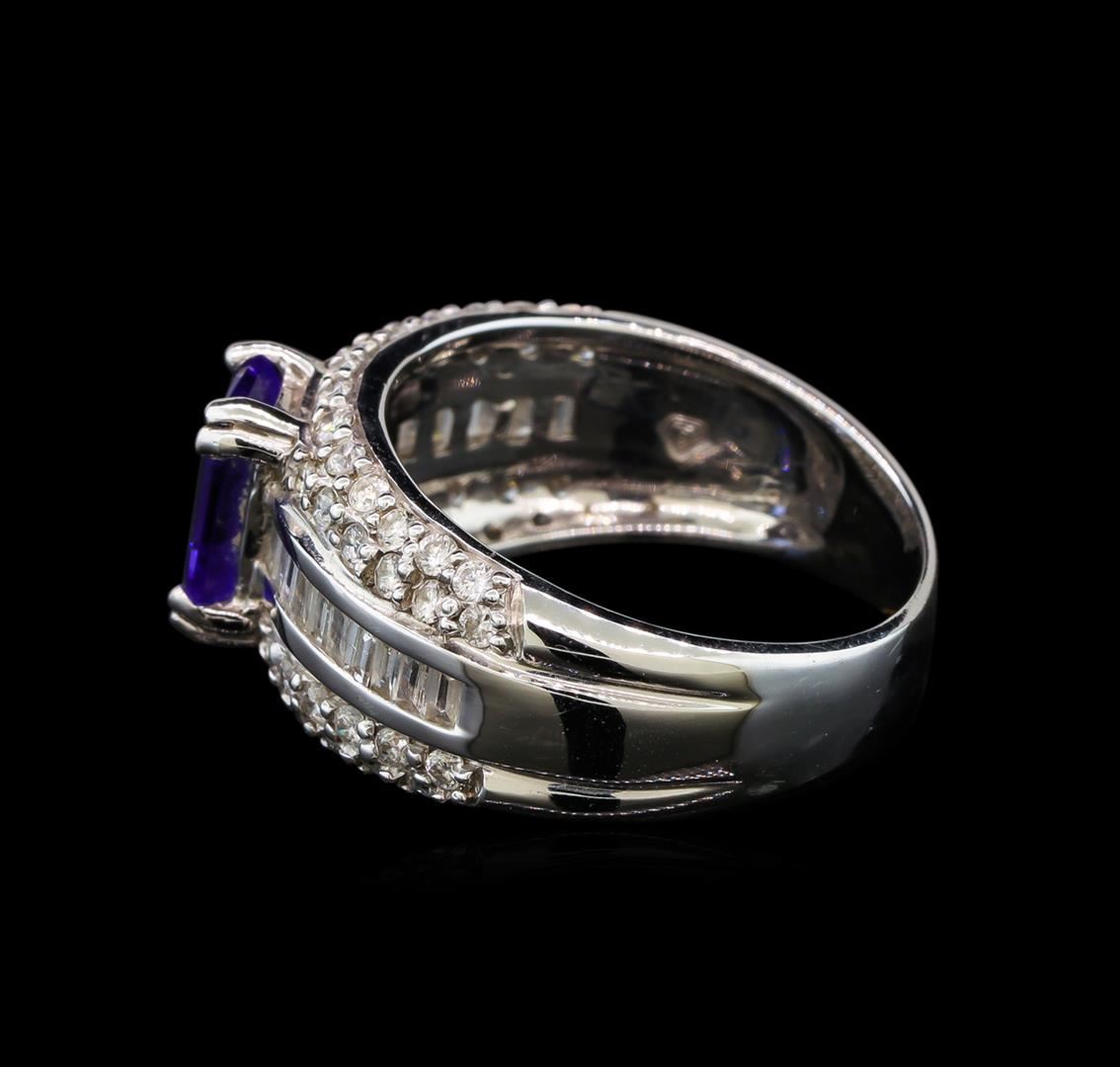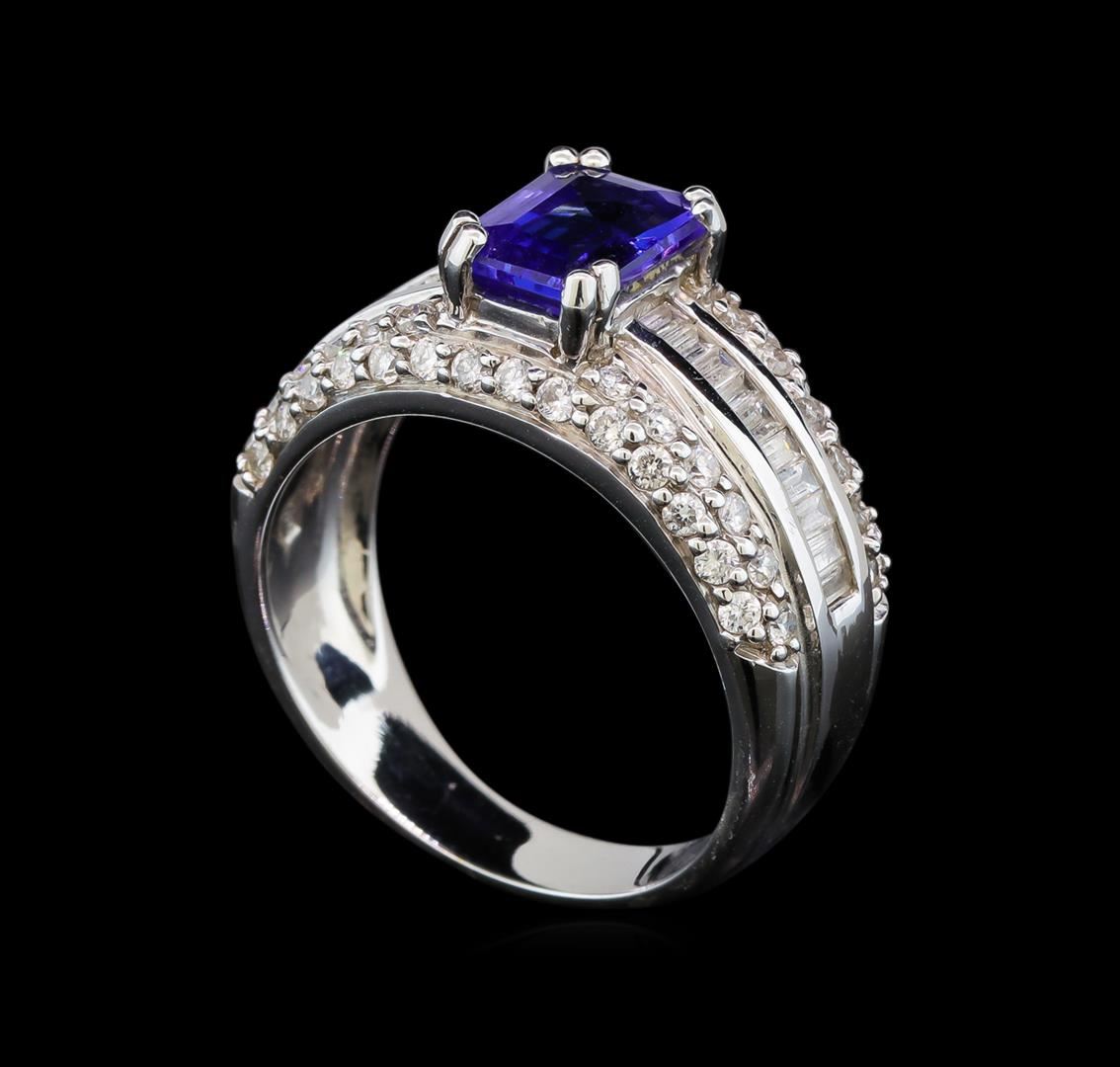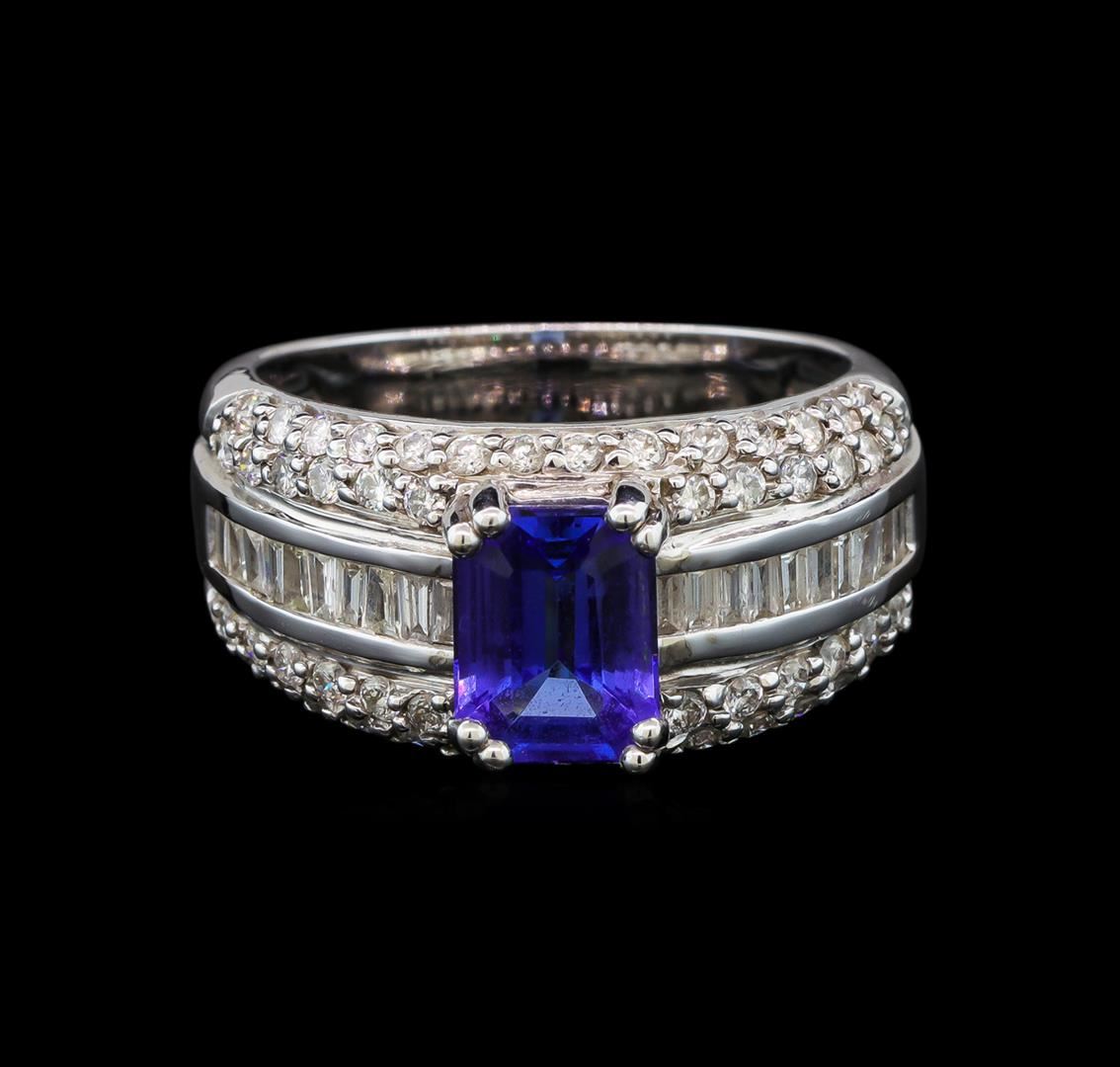 One electronically tested 14KT white gold ladies cast tanzanite and diamond ring with a bright polish finish. The featured tanzanite is supported by diamond set shoulders, completed by a three and one-half millimeter wide band. Identified with markings of "14K". Condition is new, good workmanship. Containing: One prong set emerald step cut natural tanzanite, measuring 7.65 x 5.70 x 3.50mm, 6%. bulge factor, approximate weight of 1.46ct., clarity is eye clean, type I, medium dark, moderately strong, violetish blue color, (GIA vB 6/4), cut is good. Transmitting light with no distortion, transparent. Graded in the setting. Tanzanite is a very rare gemstone that is only found in the country of Tanzania. Originally discovered in 1967. Tiffany & Company, named the stone Tanzanite. It is found in the Usumburu Mountains that border the Umba Valley of northern Tanzania. Tanzanite occurs in gray, brown, violet, blue, reddish-purple, & green. The gem is interesting because of its exceptional pleochroism. Rotated in different directions a tanzanite will exhibit multiple changes of color. Tanzanite has a low tolerance to ultrasonic cleaning, and should not be cleaned using this method. Fifty-Two prong set round brilliant cut diamonds, measuring 1.50 - 1.40 x 0.87mm (depth est.) approximate total weight of 52 Stones = 0.67ct. Graded in the setting. Clarity: SI-2 to I-1. Color: G - I Twenty channel set baguette cut diamonds, measuring from 2.00 x 1.10 x 0.77mm (depth est.) to 2.10 x 1.20 x 0.84mm (depth est.) approximate total weight of 20 Stones = 0.34ct. Graded in the setting. Clarity: SI-1 to SI-2. Color: H - I. Total Weight of Colored Stones 1.46ct. Total Weight of Diamonds 1.01ct. Total Weight of Ring 6.09 grams. AIG Appraised at $6,710.00.