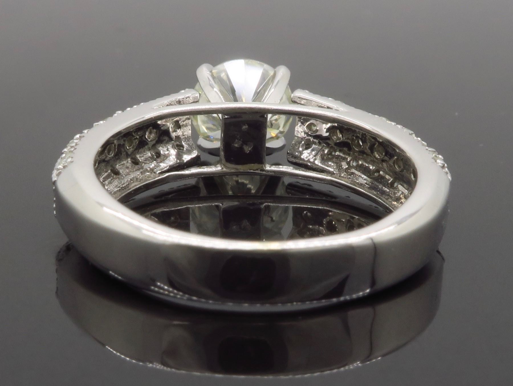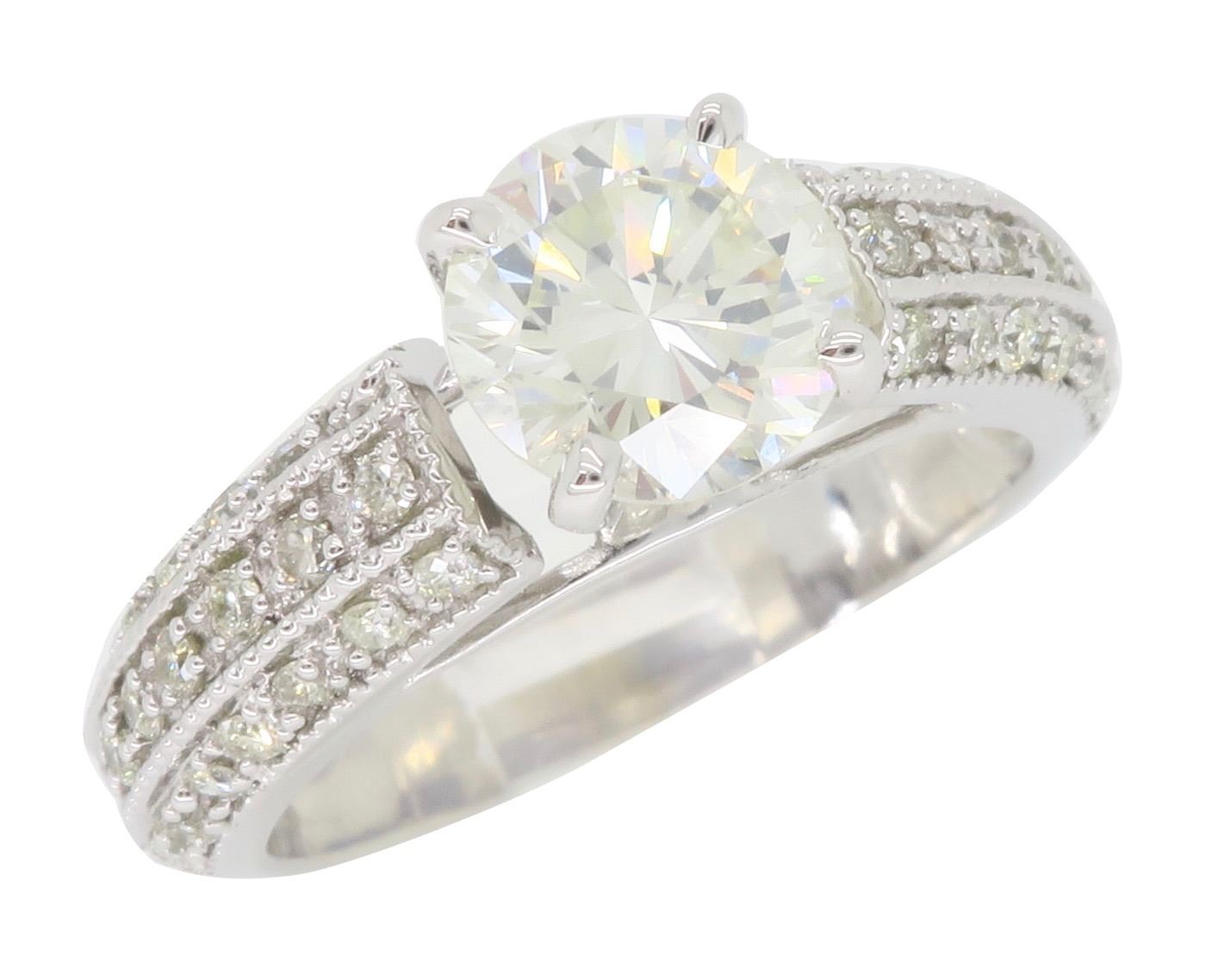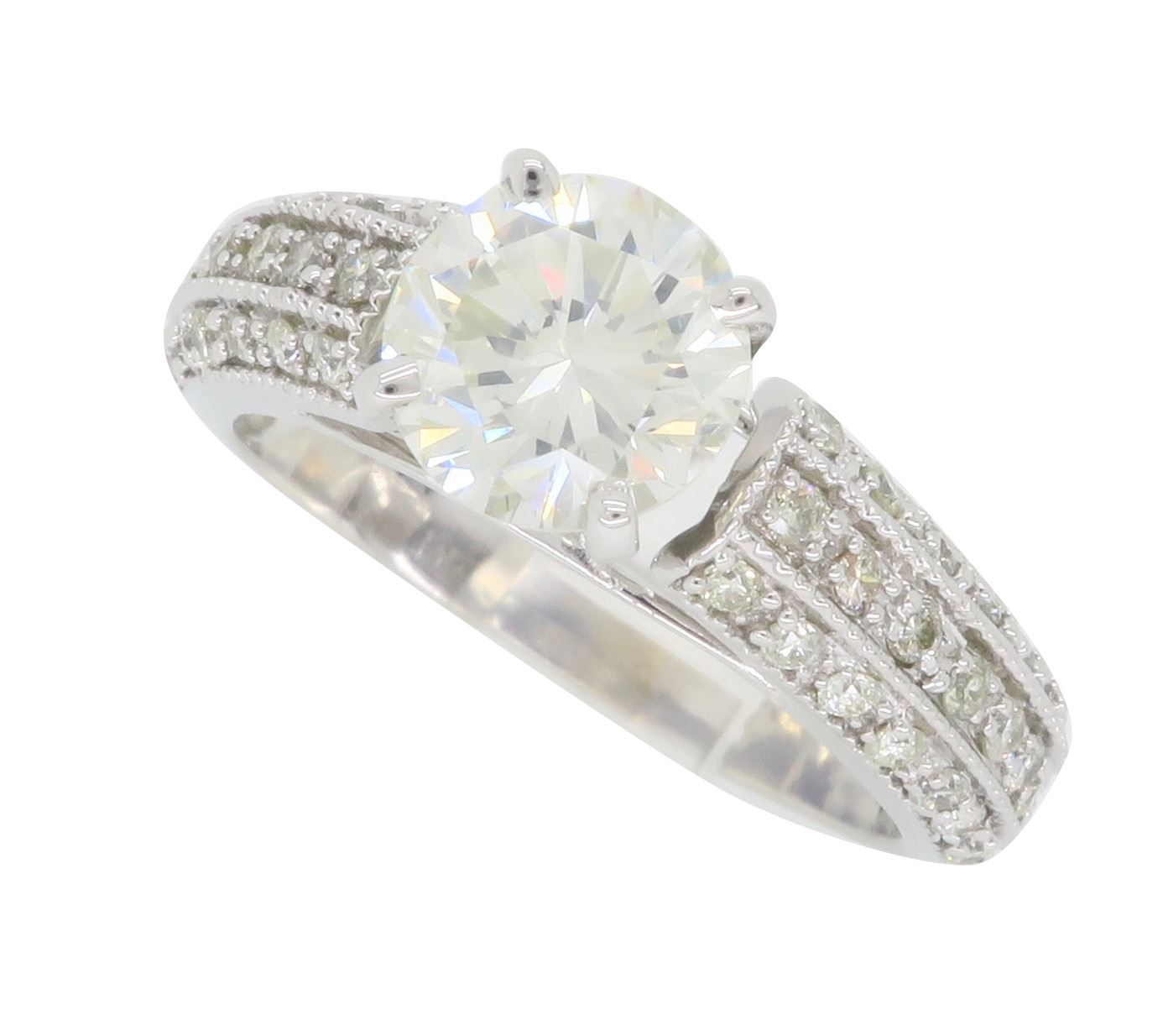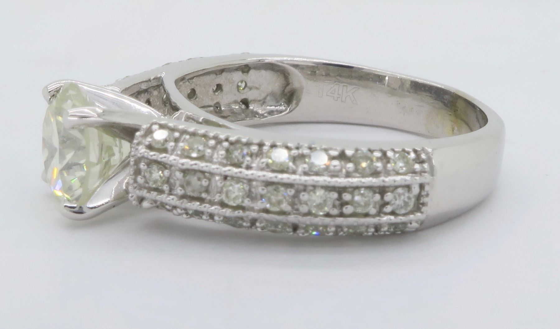 One 14KT White Gold 1.46ctw Diamond Ring. (1) round center Diamond with a total weight of 1.04cts with a color of L and clarity of SI-2. Round side Diamonds with a total weight of 0.42cts. Total weight of this ring is 3.9 grams. Ring size is 4.75.