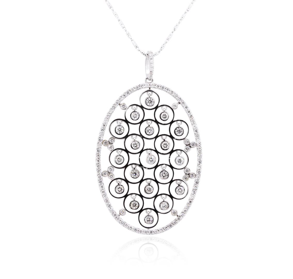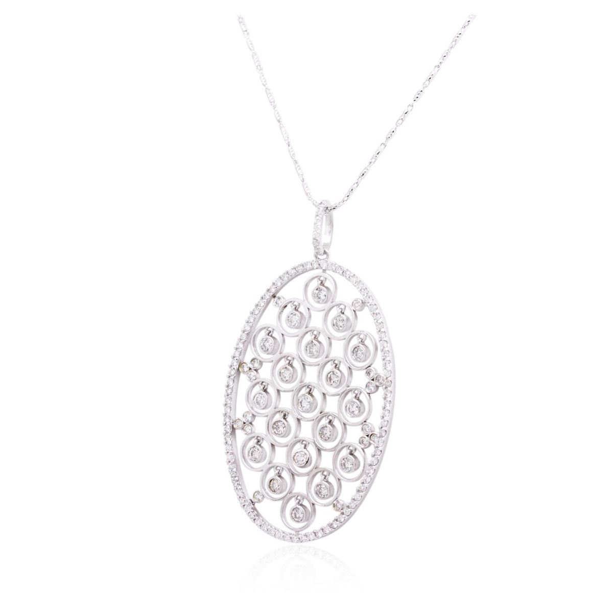 One electronically tested 14KT white gold ladies combination cast & assembled diamond pendant & chain 18.0" long, cable link with a lobster claw clasp with a bright polish finish. Identified with markings of "585". Condition is new. Containing: Nineteen bezel set round brilliant cut diamonds, measuring 2.50 - 2.50 x 1.50mm (depth est.) approximate total weight of 19 Stones = 1.09ct. Clarity: SI-2 to I-1. Color: I - J, Cut is Good. Eighty prong set round brilliant cut diamonds, measuring 1.10 - 1.10 x 0.66mm (depth est.) approximate total weight of 80 Stones = 0.38ct. Clarity: SI-2 to I-1. Color: I - J, Cut is Good. All diamonds are graded in the mounting, unless otherwise stated. Total Weight of Diamonds 1.47ct. Total Weight of Pendant & Chain 11.60 grams. GGL Appraised at $7,325.00.