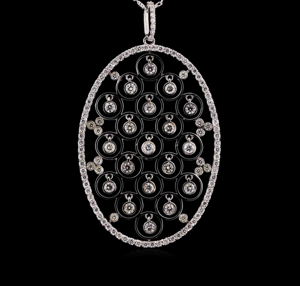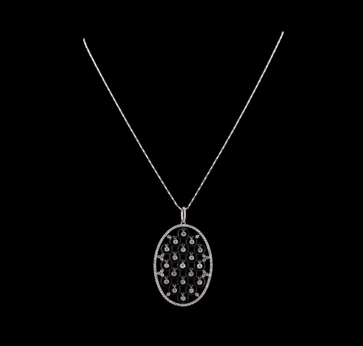 One electronically tested 14KT white gold ladies combination cast & assembled diamond pendant & chain 18.0" long, cable link with a lobster claw clasp with a bright polish finish. Identified with markings of "585". Condition is new. Containing: Nineteen bezel set round brilliant cut diamonds, measuring 2.50 - 2.50 x 1.50mm (depth est.) approximate total weight of 19 Stones = 1.09ct. Clarity: SI-2 to I-1. Color: I - J, Cut is Good. Eighty prong set round brilliant cut diamonds, measuring 1.10 - 1.10 x 0.66mm (depth est.) approximate total weight of 80 Stones = 0.38ct. Clarity: SI-2 to I-1. Color: I - J, Cut is Good. All diamonds are graded in the mounting, unless otherwise stated. Total Weight of Diamonds 1.47ct. Total Weight of Pendant & Chain 11.60 grams. GGL Appraised.