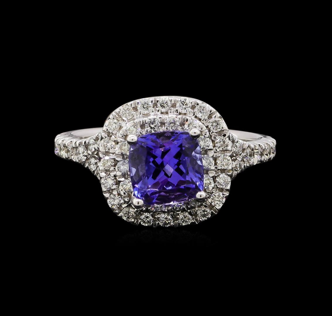 One electronically tested 14KT white gold ladies cast tanzanite and diamond ring with a bright polish finish. Identified with markings of "14KT". Condition is new. Containing: One prong set square cushion modified brilliant cut natural tanzanite, measuring 6.60 x 6.60 x 4.29mm, approximate weight of 1.47ct., clarity is eye clean, type I, medium light, very slightly grayish, violet color, (GIA V 4/3), cut is very good. Sixty prong set round brilliant cut diamonds, measuring 1.50 - 1.50 x 0.90mm (depth est.) approximate total weight of 60 Stones = 0.74ct. Clarity: SI-1 to I-1. Color: I - J, Cut is Good. Colored gemstones are presumed to have been subjected to commonly used enhancement processes. All diamonds and colored gemstones are graded in the mounting, unless otherwise stated. Total Weight of Colored Stones 1.47ct. Total Weight of Diamonds 0.74ct. Total Weight of Ring 5.30 grams. GGL Appraised at $4,010.00.