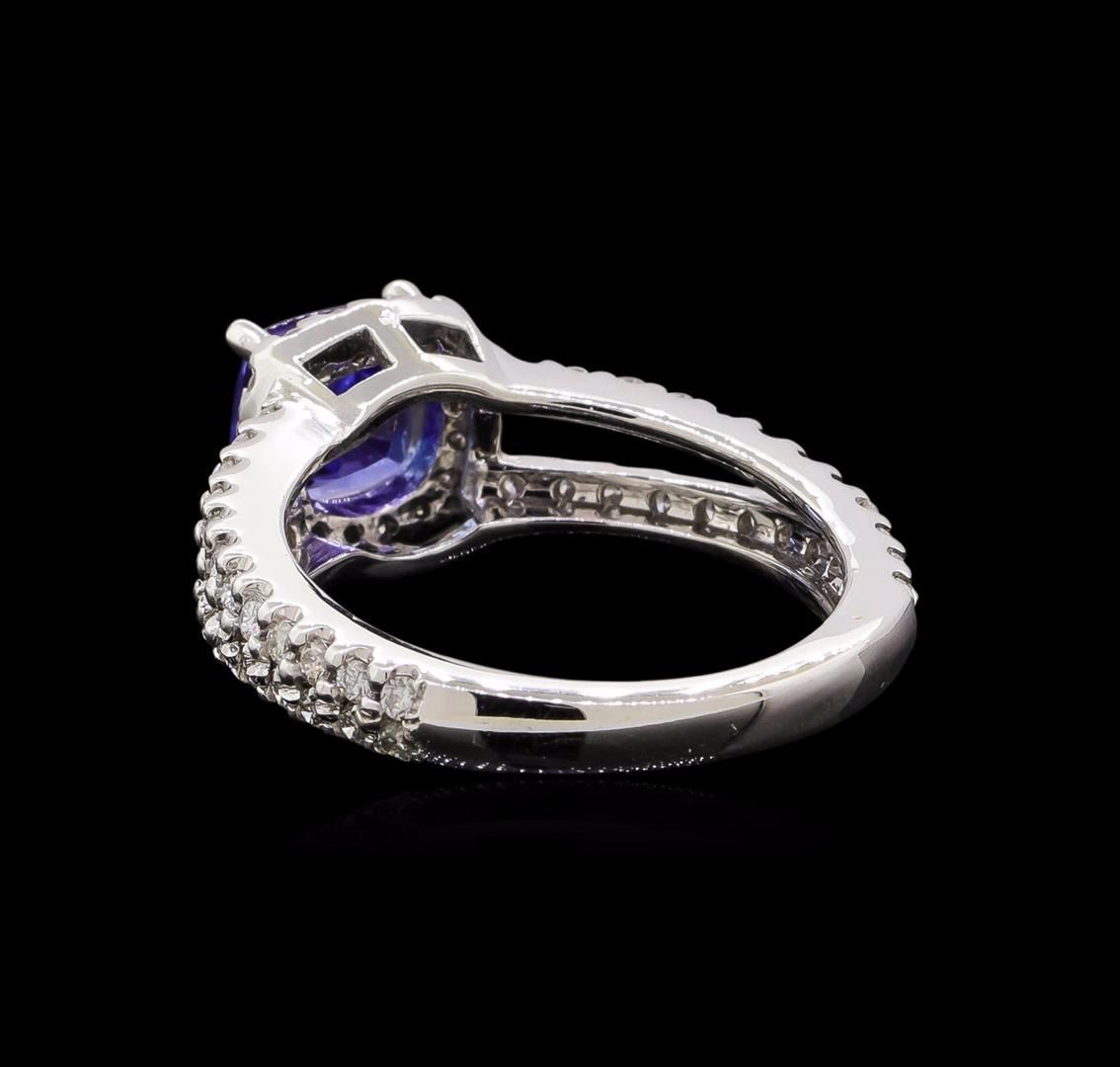 One electronically tested 14KT white gold ladies cast tanzanite and diamond ring with a bright polish finish. Identified with markings of "14KT". Condition is new. Containing: One prong set square cushion modified brilliant cut natural tanzanite, measuring 6.60 x 6.60 x 4.29mm, approximate weight of 1.47ct., clarity is eye clean, type I, medium light, very slightly grayish, violet color, (GIA V 4/3), cut is very good. Sixty-Two prong set round brilliant cut diamonds, measuring 1.30 - 1.30 x 0.78mm (depth est.) approximate total weight of 62 Stones = 0.50ct. Clarity: SI-1 to SI-2. Color: I - J, Cut is Good. Colored gemstones are presumed to have been subjected to commonly used enhancement processes. All diamonds and colored gemstones are graded in the mounting, unless otherwise stated. Total Weight of Colored Stones 1.47ct. Total Weight of Diamonds 0.50ct. Total Weight of Ring 4.60 grams. GGL Appraised at $3,505.00.