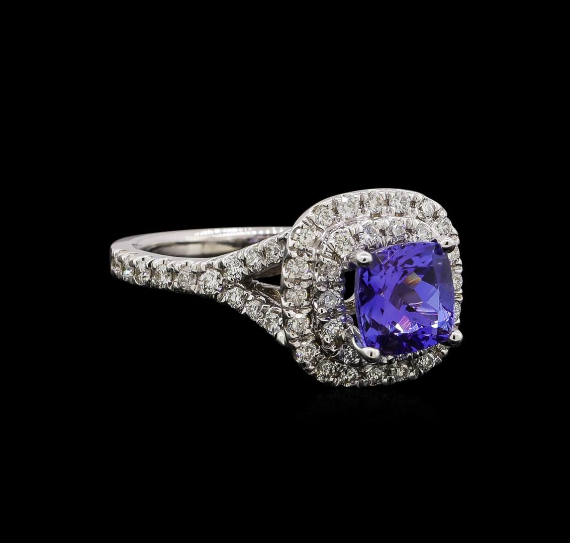 One electronically tested 14KT white gold ladies cast tanzanite and diamond ring with a bright polish finish. Identified with markings of "14KT". Condition is new. Containing: One prong set square cushion modified brilliant cut natural tanzanite, measuring 6.60 x 6.60 x 4.29mm, approximate weight of 1.47ct., clarity is eye clean, type I, medium light, very slightly grayish, violet color, (GIA V 4/3), cut is very good. Sixty prong set round brilliant cut diamonds, measuring 1.50 - 1.50 x 0.90mm (depth est.) approximate total weight of 60 Stones = 0.74ct. Clarity: SI-1 to I-1. Color: I - J, Cut is Good. Colored gemstones are presumed to have been subjected to commonly used enhancement processes. All diamonds and colored gemstones are graded in the mounting, unless otherwise stated. Total Weight of Colored Stones 1.47ct. Total Weight of Diamonds 0.74ct. Total Weight of Ring 5.30 grams. GGL Appraised at $4,010.00.