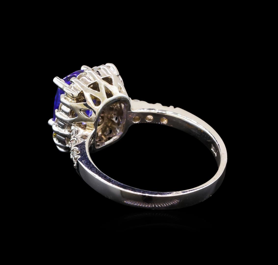 One electronically tested 14KT white gold ladies cast tanzanite and diamond ring with a bright polish finish. Identified with markings of "14K". Condition is new. Containing: One prong set rectangular cushion modified brilliant cut natural tanzanite, measuring 8.00 x 6.00 x 3.90mm, approximate weight of 1.47ct., clarity is eye clean, type I, medium, moderately strong, bluish violet color, (GIA bV 5/4), cut is good. Twenty prong set round brilliant cut diamonds, measuring 2.00 - 1.90 x 1.17mm (depth est.) approximate total weight of 20 Stones = 0.54ct. Clarity: SI-1 to I-1. Color: I - J, Cut is Good. Colored gemstones are presumed to have been subjected to commonly used enhancement processes. All diamonds and colored gemstones are graded in the mounting, unless otherwise stated. Total Weight of Colored Stones 1.47ct. Total Weight of Diamonds 0.54ct. Total Weight of Ring 4.80 grams. GGL Appraised at $3,020.00.