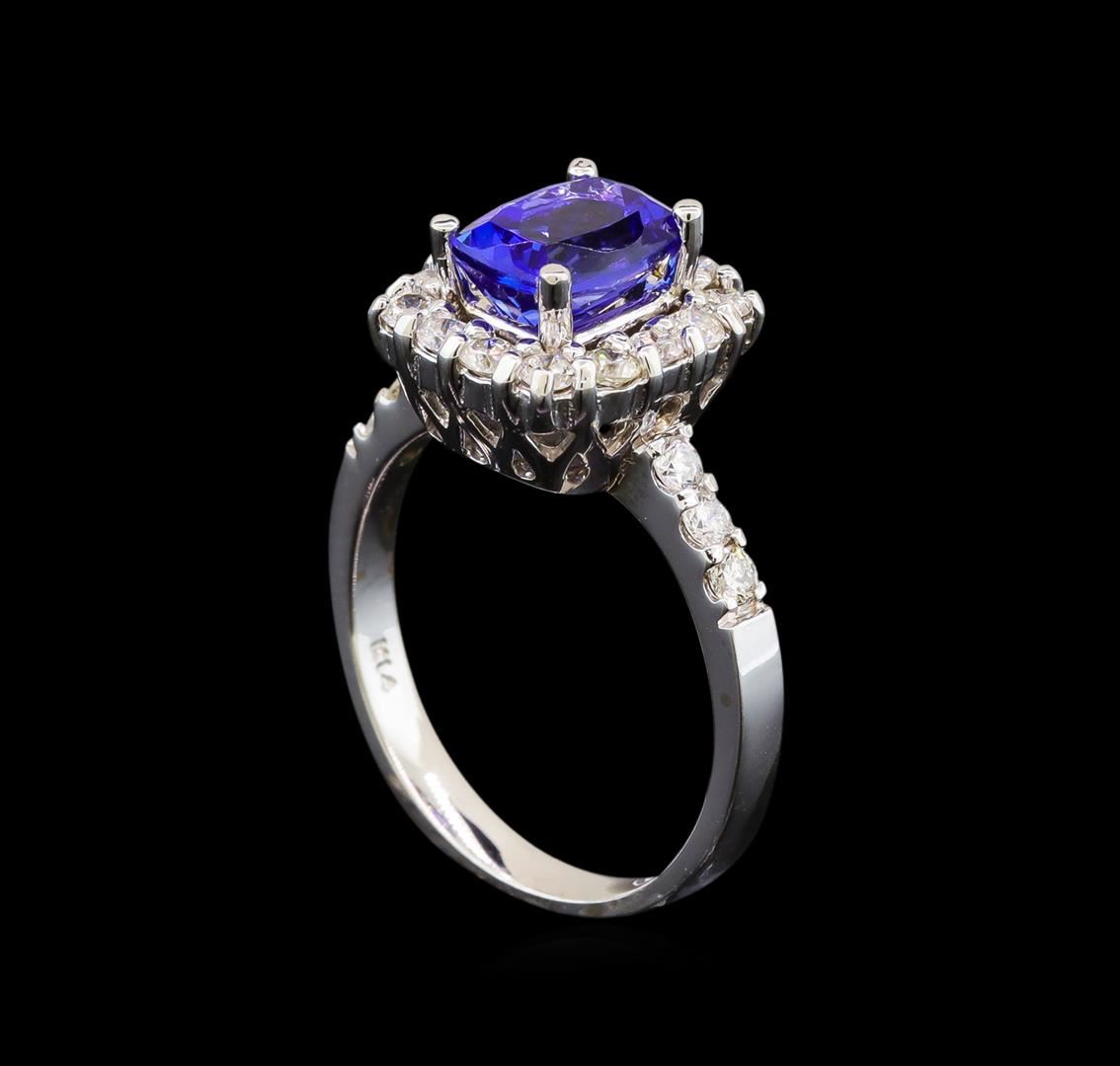 One electronically tested 14KT white gold ladies cast tanzanite and diamond ring with a bright polish finish. Identified with markings of "14K". Condition is new. Containing: One prong set rectangular cushion modified brilliant cut natural tanzanite, measuring 8.00 x 6.00 x 3.90mm, approximate weight of 1.47ct., clarity is eye clean, type I, medium, moderately strong, bluish violet color, (GIA bV 5/4), cut is good. Twenty prong set round brilliant cut diamonds, measuring 2.00 - 1.90 x 1.17mm (depth est.) approximate total weight of 20 Stones = 0.54ct. Clarity: SI-1 to I-1. Color: I - J, Cut is Good. Colored gemstones are presumed to have been subjected to commonly used enhancement processes. All diamonds and colored gemstones are graded in the mounting, unless otherwise stated. Total Weight of Colored Stones 1.47ct. Total Weight of Diamonds 0.54ct. Total Weight of Ring 4.80 grams. GGL Appraised at $3,020.00.