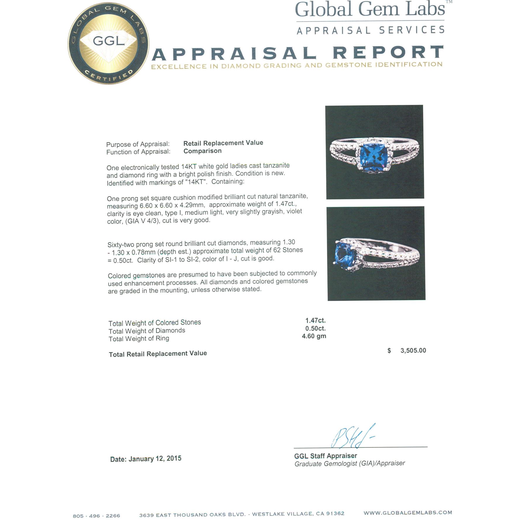 One electronically tested 14KT white gold ladies cast tanzanite and diamond ring with a bright polish finish. Identified with markings of "14KT". Condition is new. Containing: One prong set square cushion modified brilliant cut natural tanzanite, measuring 6.60 x 6.60 x 4.29mm, approximate weight of 1.47ct., clarity is eye clean, type I, medium light, very slightly grayish, violet color, (GIA V 4/3), cut is very good. Sixty-Two prong set round brilliant cut diamonds, measuring 1.30 - 1.30 x 0.78mm (depth est.) approximate total weight of 62 Stones = 0.50ct. Clarity: SI-1 to SI-2. Color: I - J, Cut is Good. Colored gemstones are presumed to have been subjected to commonly used enhancement processes. All diamonds and colored gemstones are graded in the mounting, unless otherwise stated. Total Weight of Colored Stones 1.47ct. Total Weight of Diamonds 0.50ct. Total Weight of Ring 4.60 grams. GGL Appraised at $3,505.00.